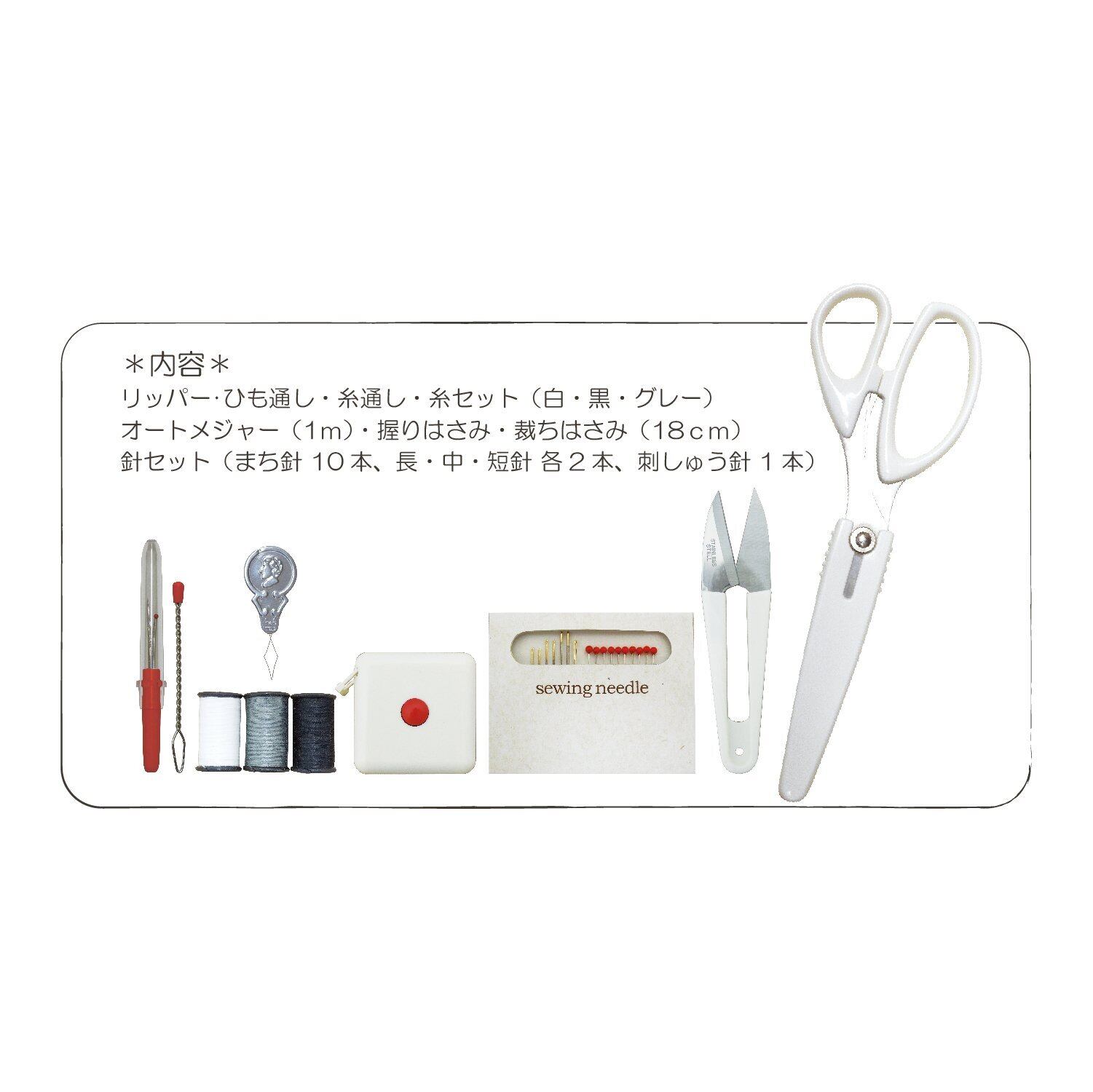 セット内容:リッパー、ひも通し、糸セット(白・黒・グレー)、オートメシジャー(1m)、握りばさみ、裁ちばさみ(18cm)、針セット(待ち針10本、長・中・短針各2本、刺しゅう針1本)