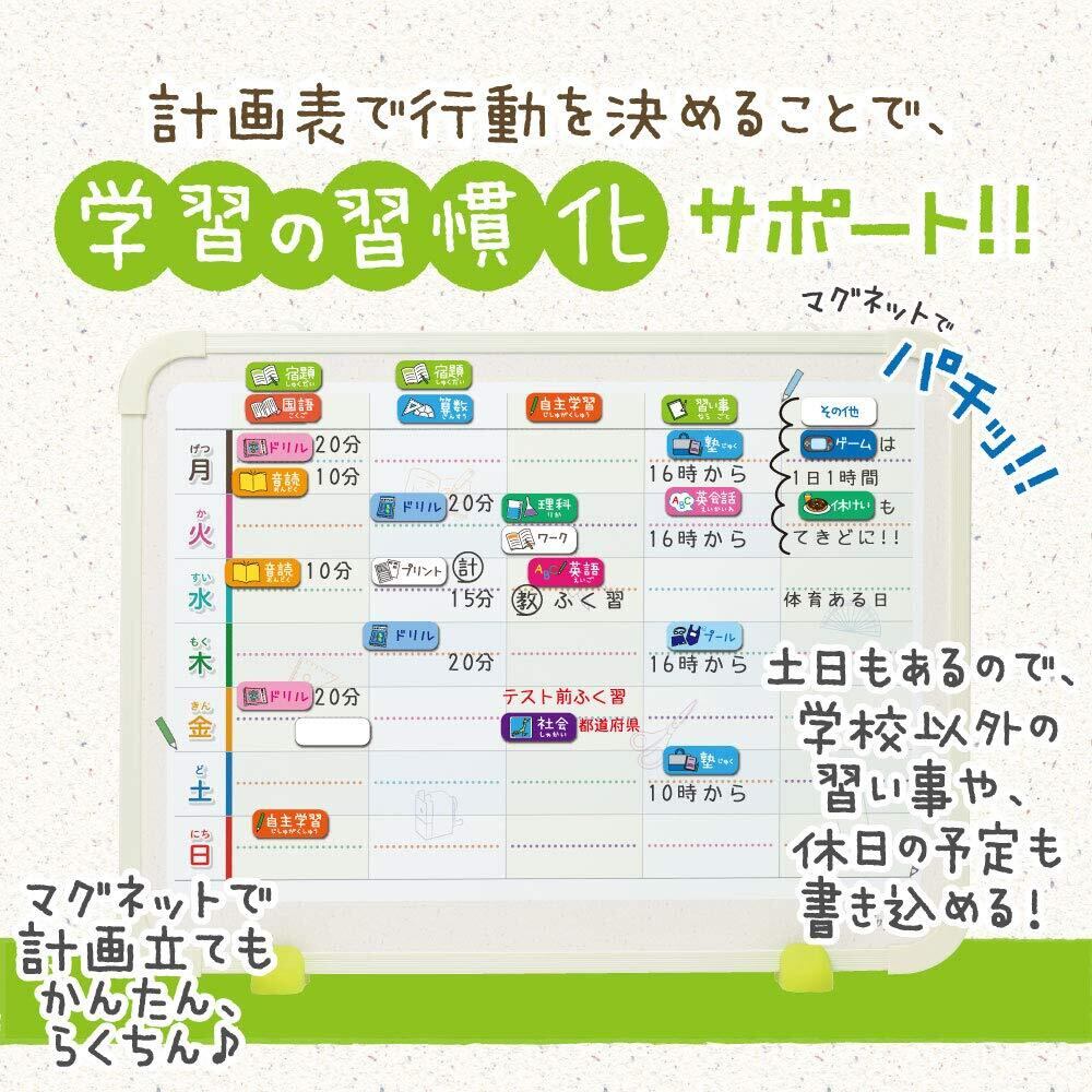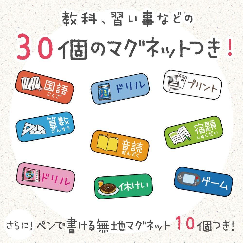 「国語」「宿題」や「習い事」「塾」などのマグネットでスケジュールを1週間の見える化。