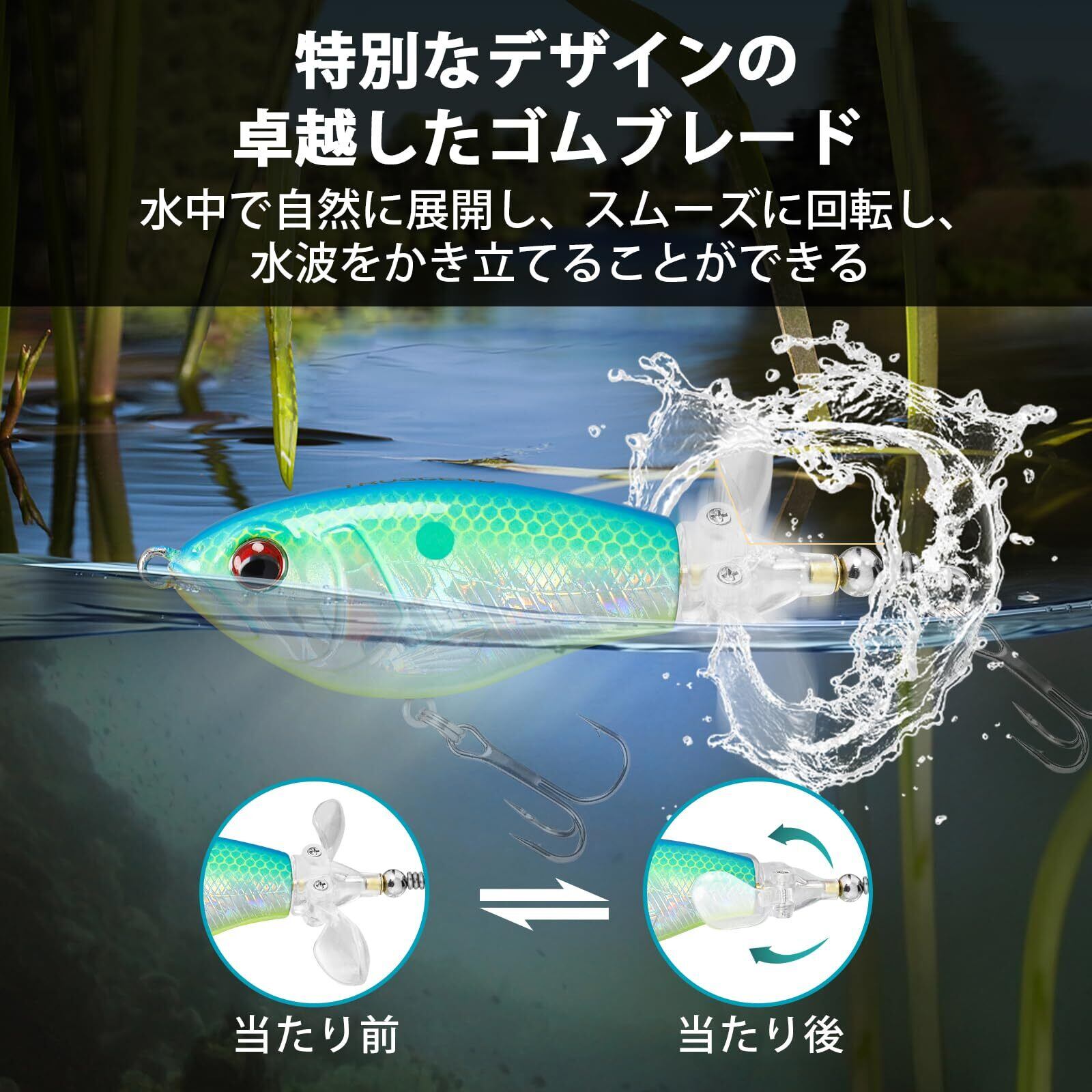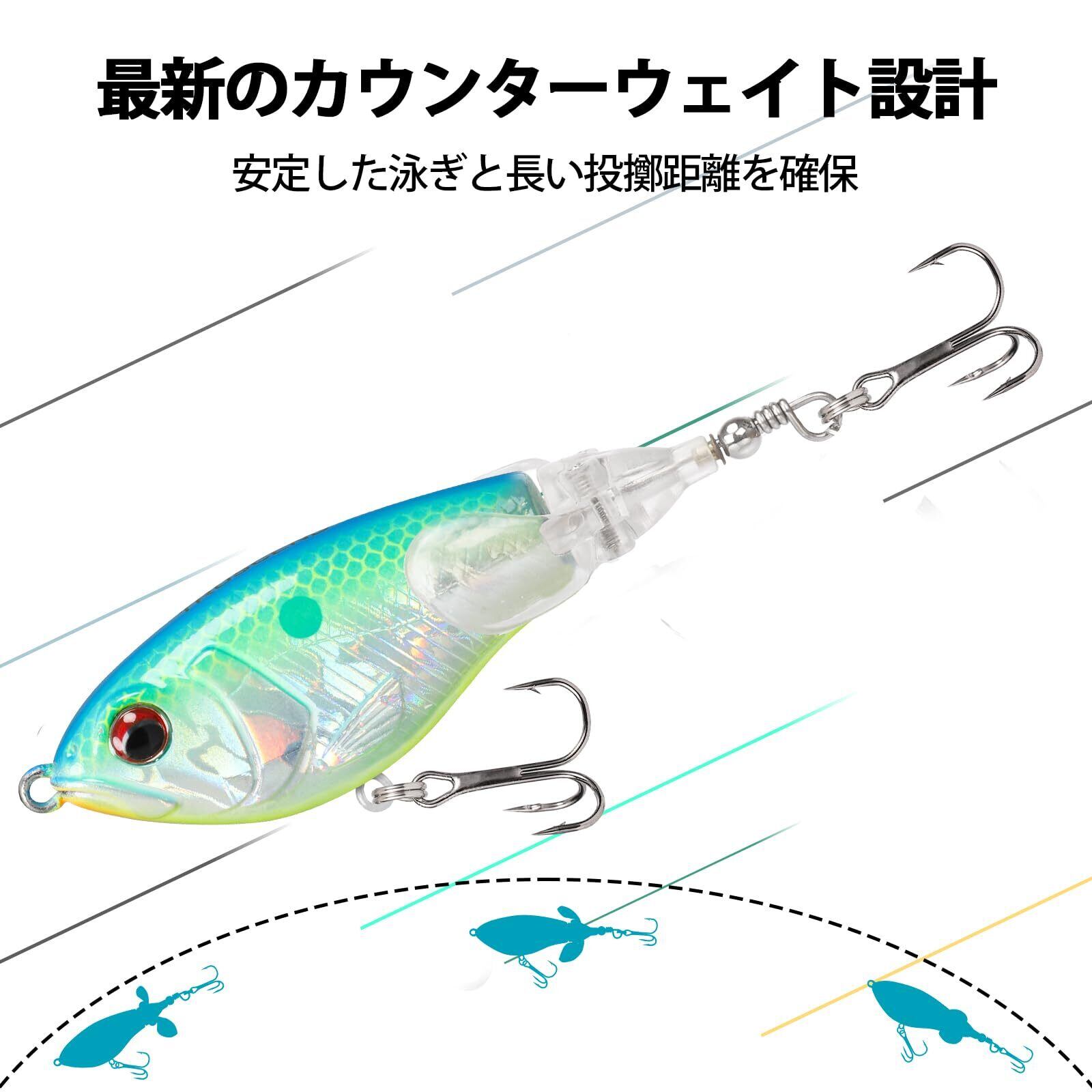 【子供でもすぐに使いこなすルアー!】このTRUSCENDのサーフェス系ルアーは、ダブルパドルのデザインで、水面で移動する時に水しぶきを上げながらポタポタと水音を立てます。水波と水音の共の魅力で、シーバスのような捕食魚の注意を素早く引きつけることができます。また、速くても遅くても、ブレードがスムーズに回転して、水波を発生させて、魚を引き寄せます。子供であろうと、初心者であろうと、プロであろうと、このルアーをすぐに使いこなし、釣りの醍醐味を感じることができるだろう。