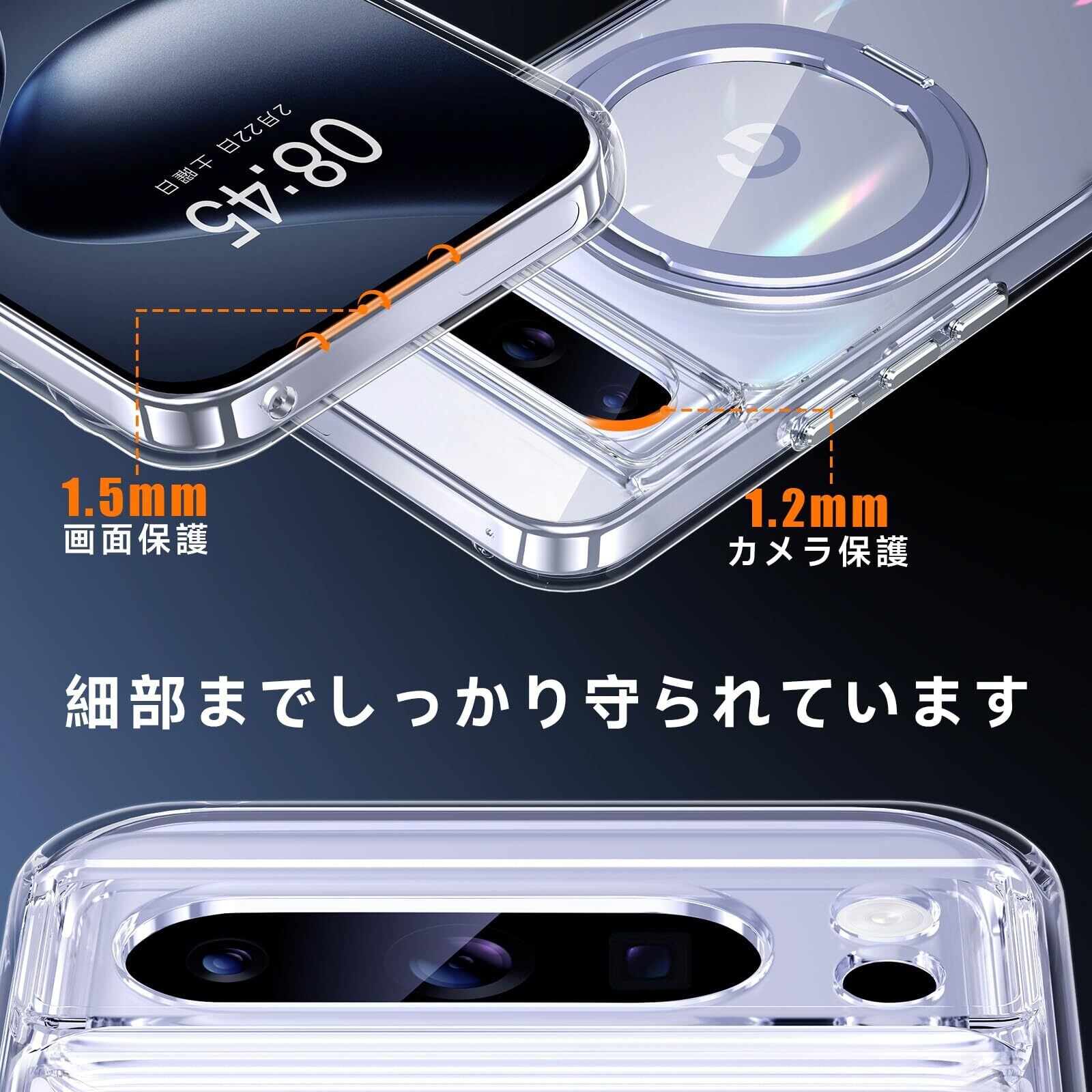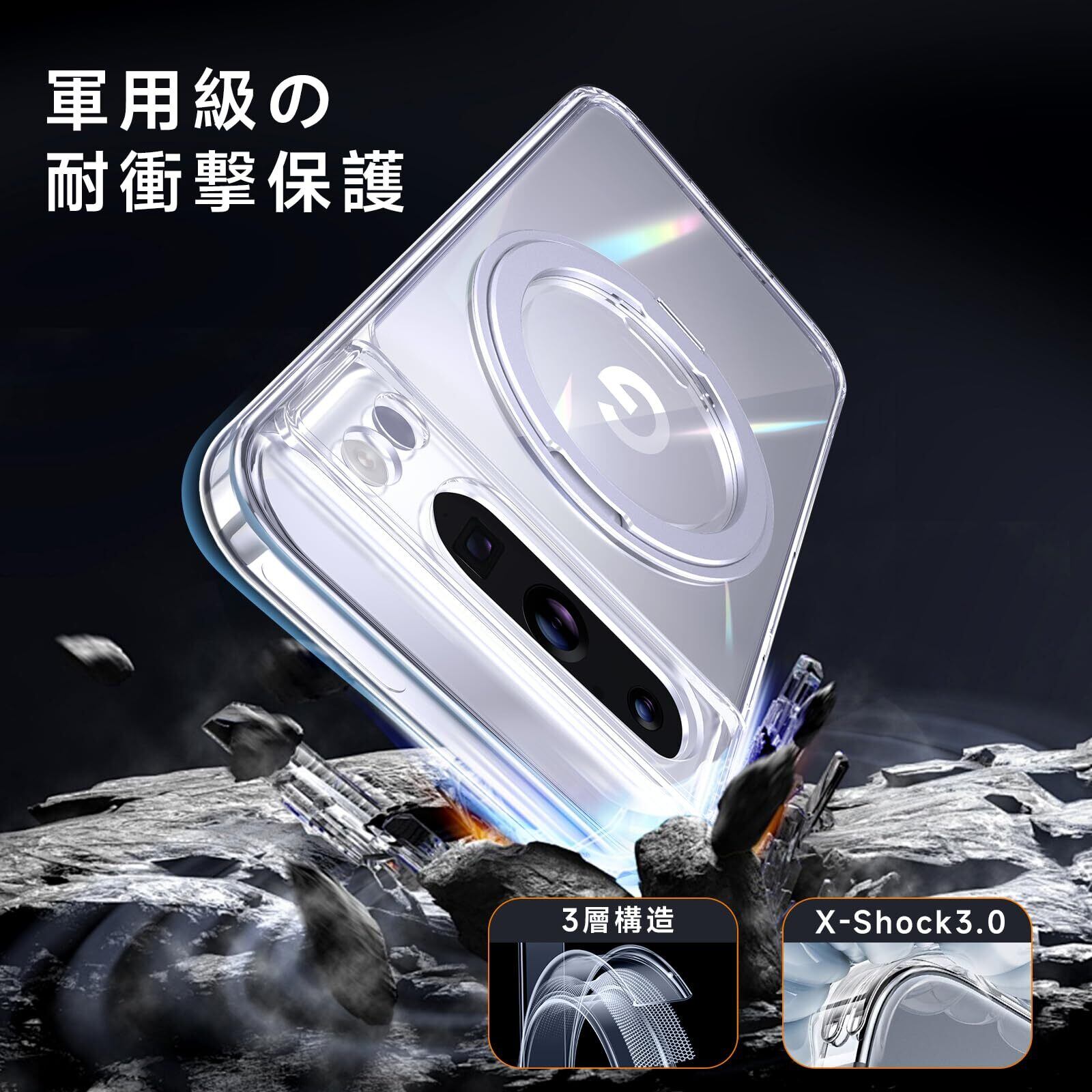 【米軍MIL規格準拠・高耐衝撃性能】米国国防総省の耐衝撃試験「MIL-STD-810G」に準拠し、耐衝撃性能が従来比20倍アップ!スマホの落下時に特に衝撃を受けやすい四隅には、衝撃を分散するクッション構造を採用。また、ケースの側面には柔軟性の高いTPU素材を使用し、耐衝撃性を強化。Google Pixel 8 Proをしっかりと守ります。