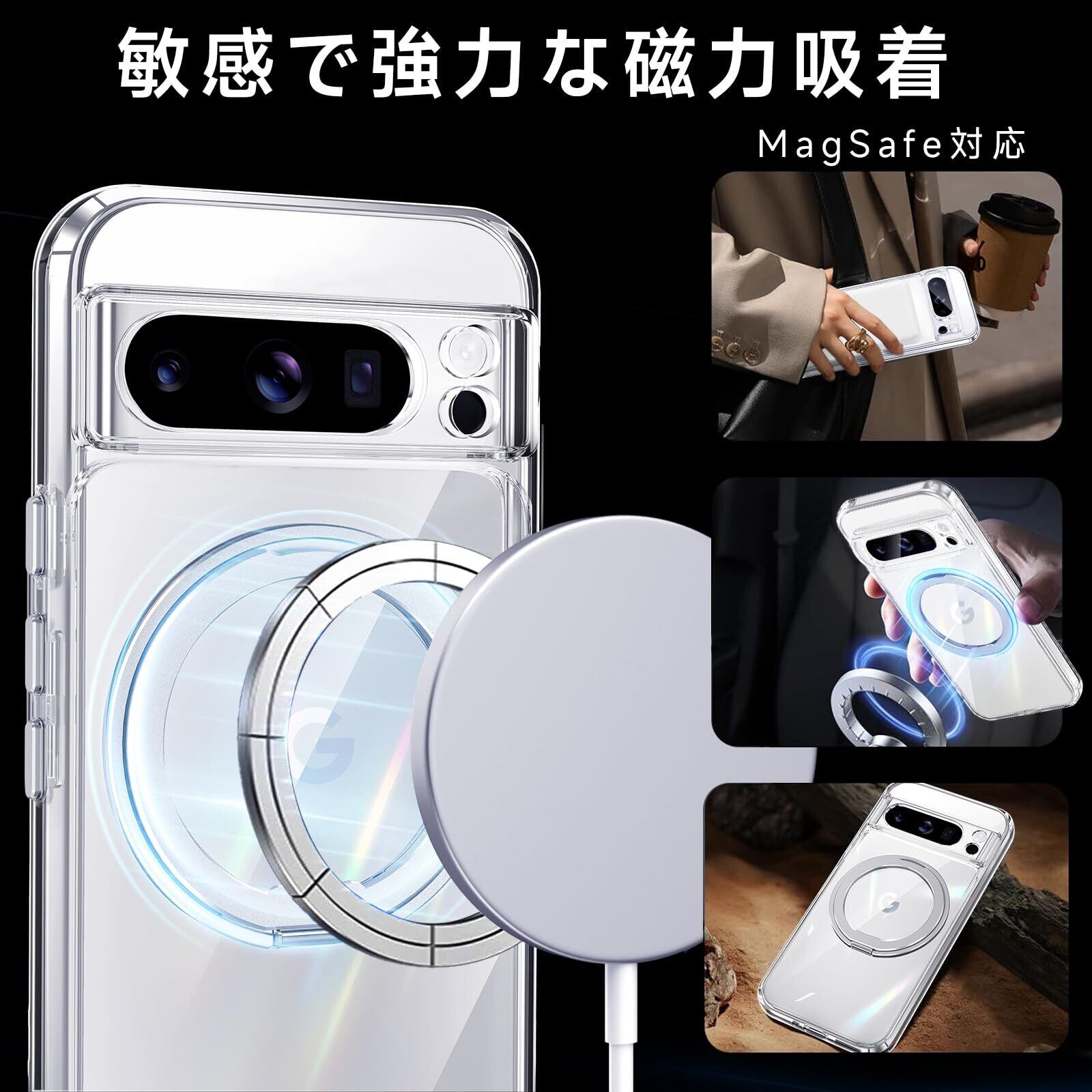 【米軍MIL規格・Magsafe対応】Google Pixel 8 Pro 用 ケース MagSafe対応 リング360°回転スタンド機能 縦横両対応 透明 黄ばみ防止 ワイヤレス充電 レンズ保護 耐衝撃 携帯カバー 6.7 インチ マグネット搭載 車載ホルダー マグセーフ対応 おしゃれ(クリア)