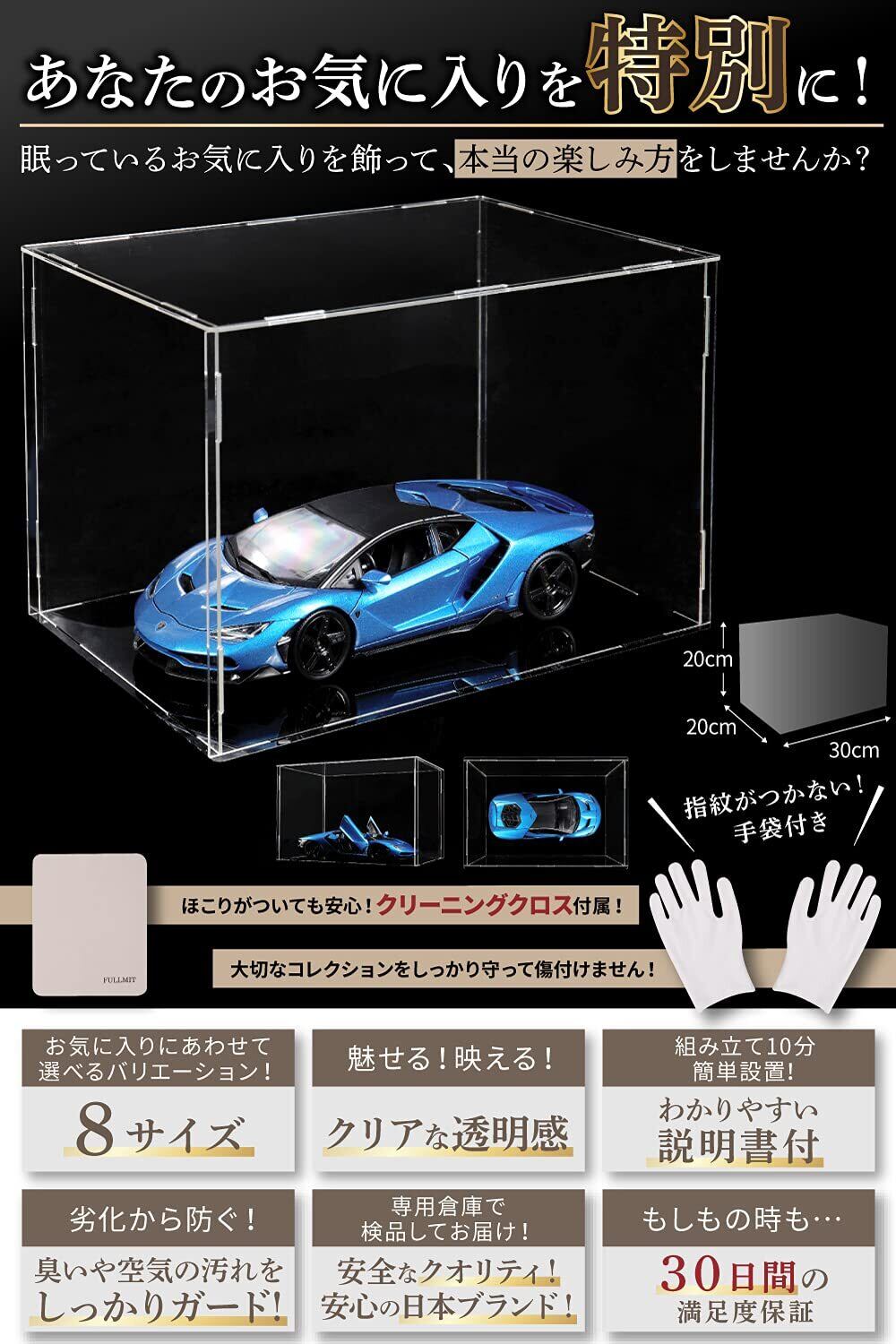 【選べるサイズ】フルミット フィギュアケース アクリル コレクションケース 高透明度 【UVカット】 透明収納ケース 組み立て 簡単 防汚れ 手袋 クリーニング クロス付き お手入れ方法 説明書 (縦30 x 横20 x 高20cm)