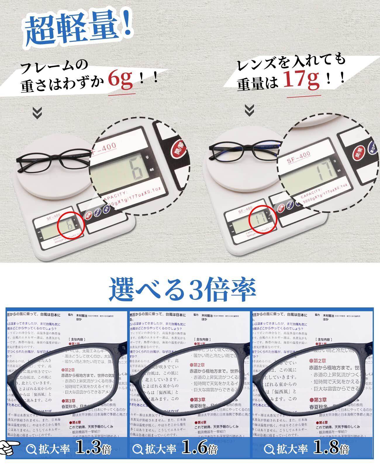 【軽量で弾力性に優れたTRフレーム】フレームの重さはわずか6.0g、折れないTR90仕様の超軽量弾性樹脂フレームとテンプルの採用により、とても軽量で、弾力性を持ち衝撃に強く、変形しにくく、折れにくい、金属アレルギー対策などの特徴があります。少々曲げても折れることなく、快適にお使いいただけます。掛けやすく丈夫ですから、スポーツをする方や小なお子様やお孫さんによくメガネを触られて変形してしまうという方には最適ではないでしょうか?大き過ぎず小さ過ぎずシンプルで掛けやすいなので男性、女性問わず、どなたにもお似合いになりご愛用頂けます。フィット感が良く型崩れしにくい超軽量ルーペメガネです。※本製品は眼鏡の上から重ねてご使用できないタイプです。