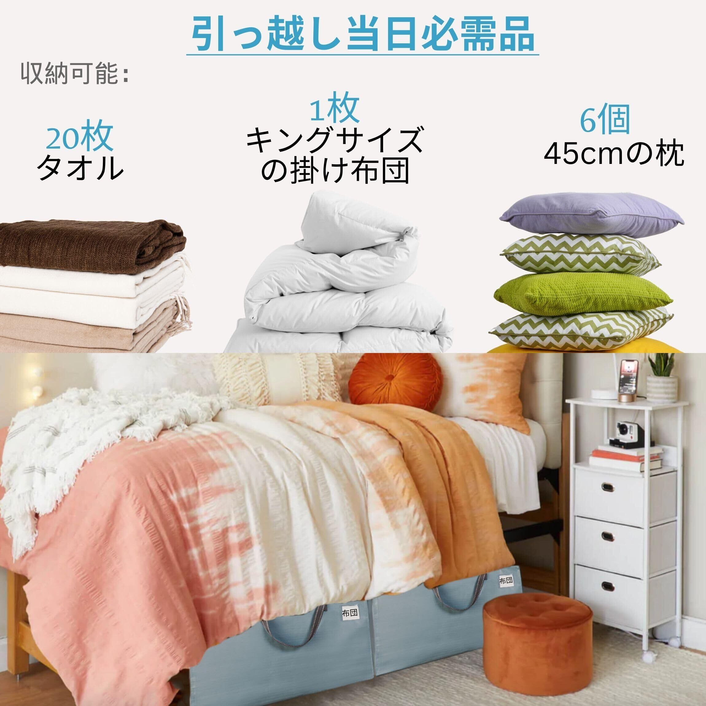 【広々とした収納】サイズは長さ70cm × 幅35cm × 高さ42cmで、容量は103リットルとなっています。プレミアムデュアルタブジッパーを採用しており、3面ファスナーが大きく開くので、荷物の出し入れが簡単です。衣類収納、布団収納、毛布からタオル、祝日の装飾品、靴、キャンプ用品、クッション、インフレータブルベッド、ワークアウトギアまで、この特大サイズの収納袋は、すべてを収納可能です。