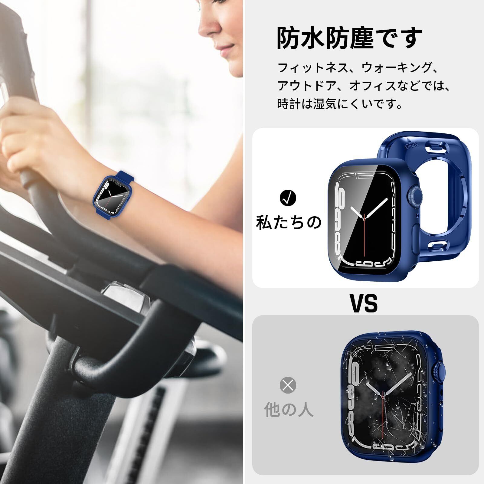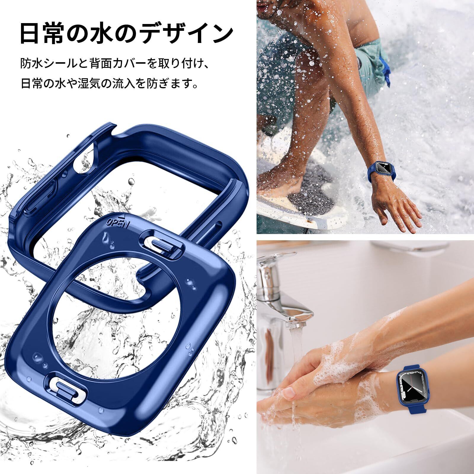 【360ど度 防水設計】Apple Watch ケース特殊加工による360ど度 防水設計により、 手を洗う時はもちろん汗をかいた時、シャワーを浴びた時にもかかわらずにアップルウォッチをご使用できます。 ※アップルウォッチ本来の防水性能を向上させるものではありません。プールや海などの水場でのご使用時はアップルウォッチの説明に従い、スキューバダイビング、ウォータースキーなど、水圧が高くなったり、所定の水深より深く潜るようなアクティビティはしないでください。