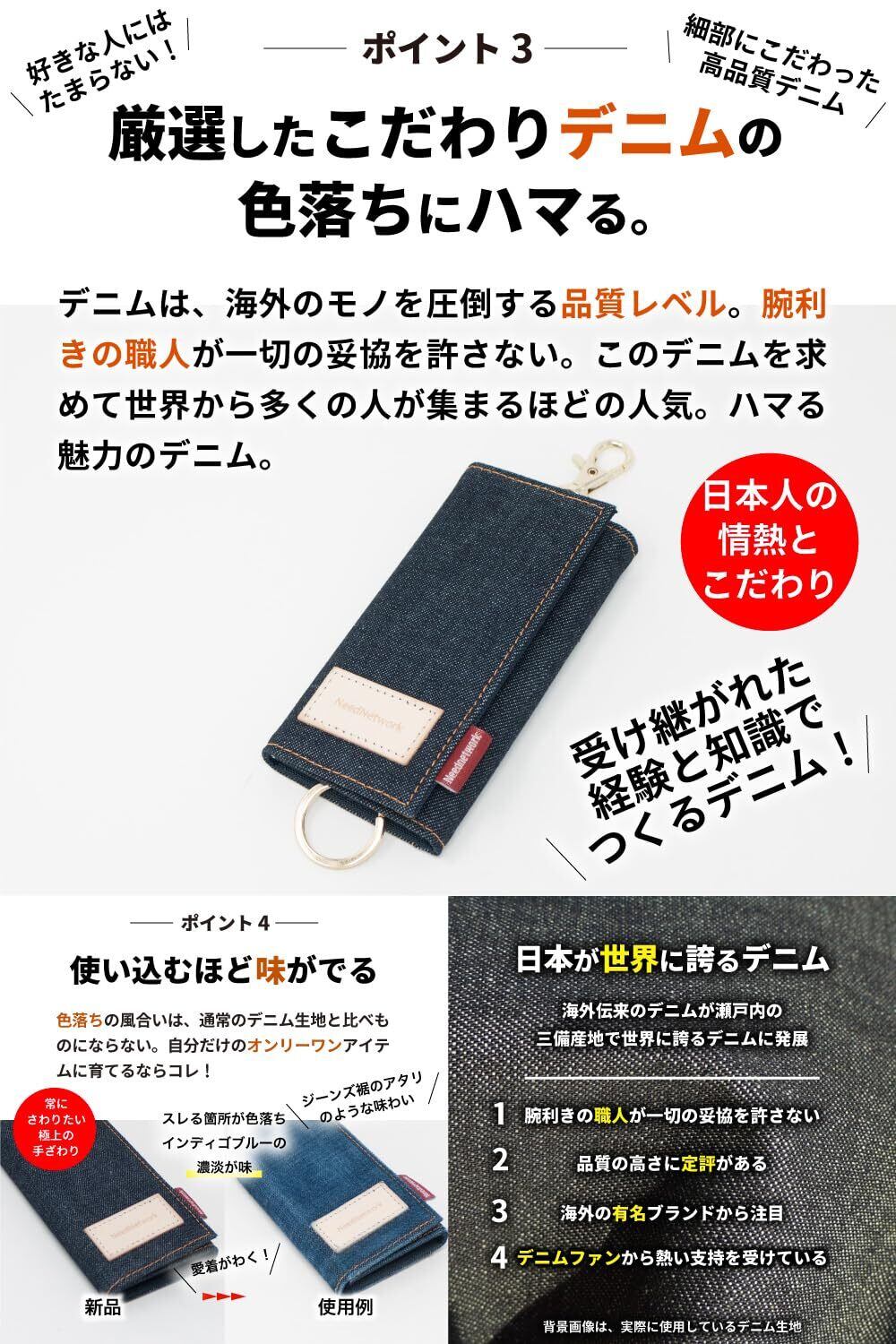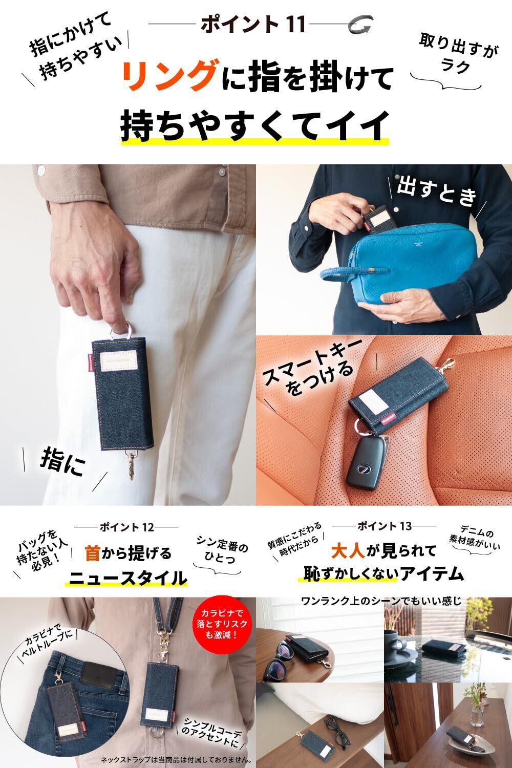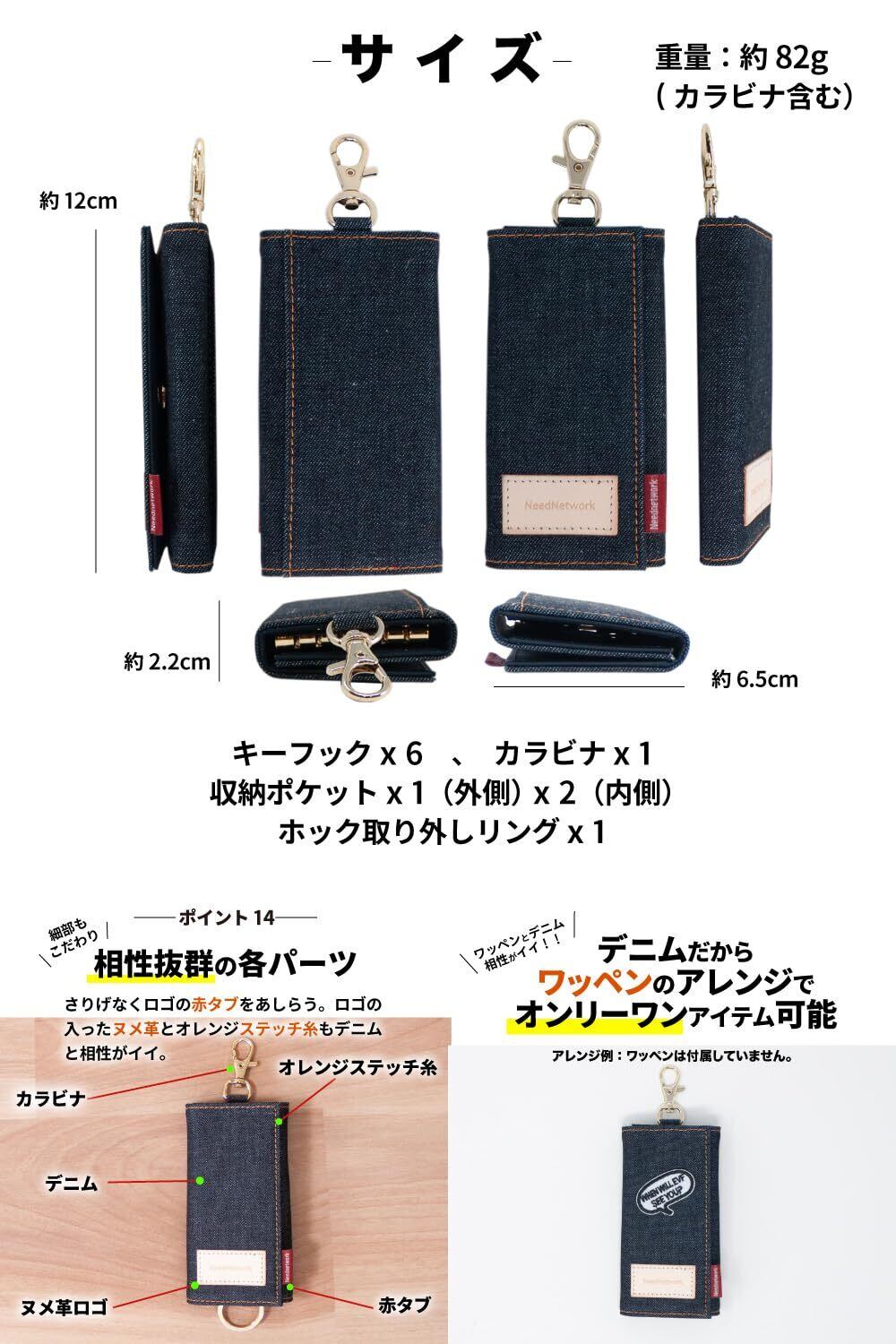 【デニムの魅力にハマる。キーケース】鍵とスマートキーとカードが1つにまとまる ▶︎毎日持ち歩くものを1つに。毎日の出入りだから1つにすると楽チン ▶︎従来の鍵だけでなくスマートキーやカードキーも1つで持てる。世界でも名高い日本製デニムから厳選したデニム生地を使用したキーケース ▶︎この高品質なデニム生地は、海外のモノを圧倒する品質レベル。腕利きの職人が一切の妥協を許さない使い込むほど味が出る ▶︎色落ちの風合いは、一般的なデニム生地と比べものにならない。自分だけのオンリーワンに育てるならコレ。コンパクトでスリムだからポケットも出し入れしやすい ▶︎手のひらサイズ。軽量約82グラム。ホックで分離できるのでアイディア次第で便利に▶︎ 車や自転車のキーに最適。まとめて持つのに便利なポケットが3つ▶︎ 通勤、通学に大活躍。バッグやポケットに入るサイズ感が魅力▶︎ バッグやポケットの中でスマホを傷つけない。自在に動いて使いやすい6連キーフック ▶︎内側素材は傷に強い教科ナイロン。サイズ、横 約6.5cm 縦 約12cm 厚さ2.2cm ■重量、約82g(カラビナ含む)