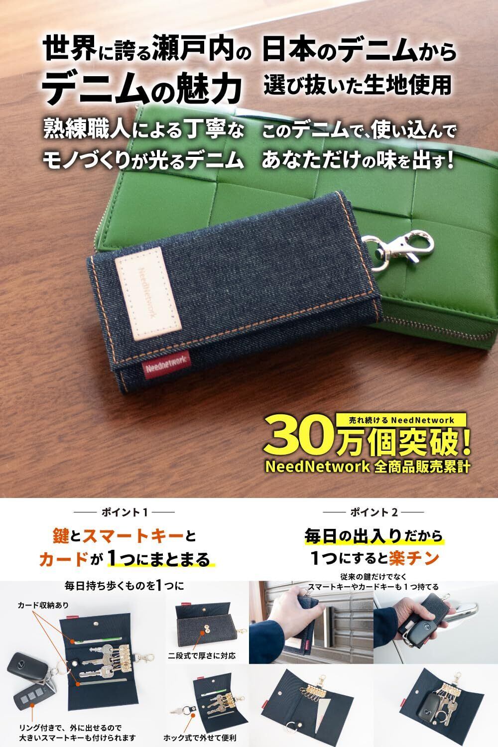 [ニードネットワーク] キーケース メンズ 6連フック 日本が誇るデニム スマートキーケース カラビナ インディゴブルー