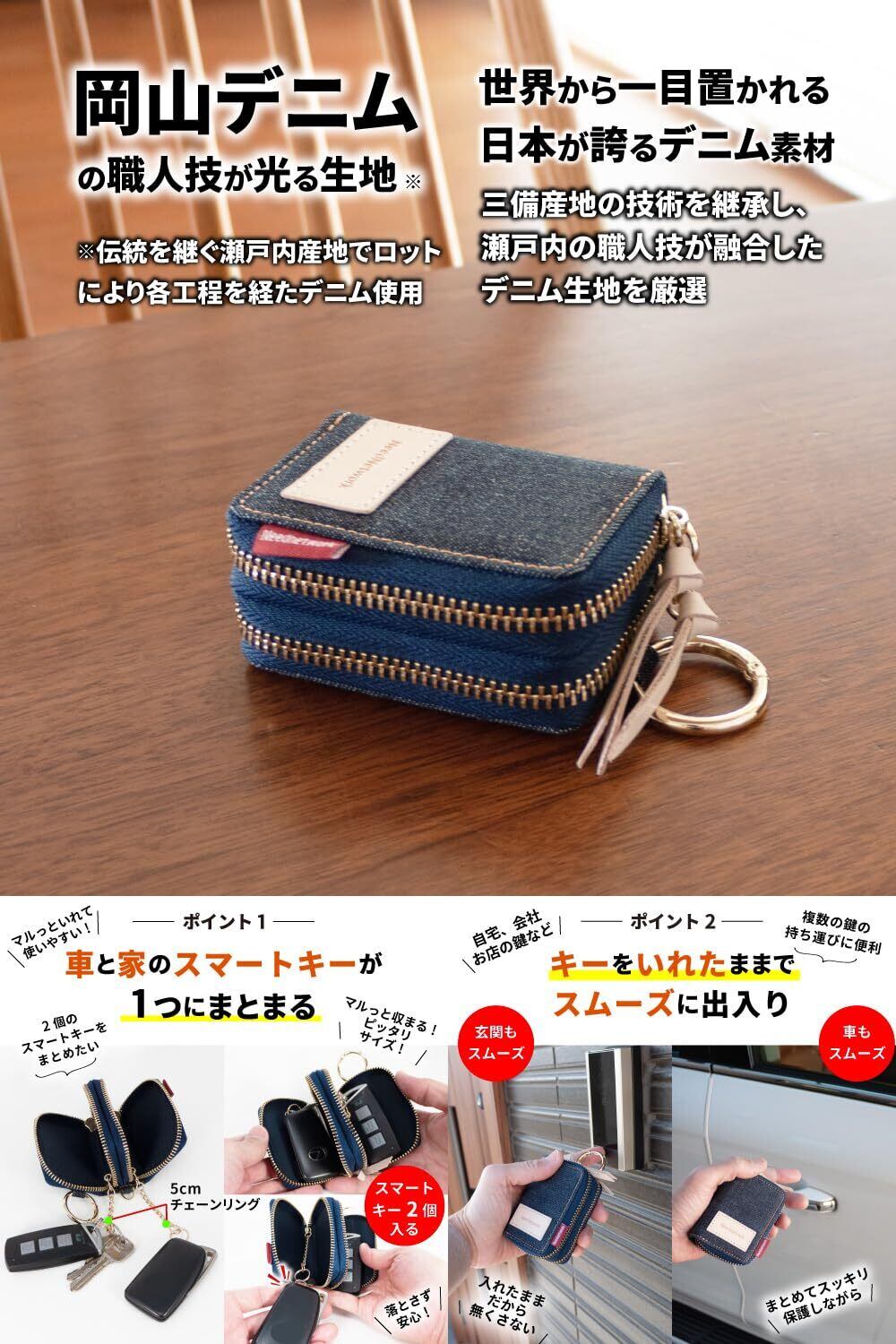 【デニムの魅力にハマる。スマートキーケース】車と家のスマートキーが1つにまとまる ▶︎マルっと入れて使いやすい。キーを入れたままでスムーズに出入り ▶︎複数の鍵の持ち運びに便利。世界でも名高い日本製デニムから厳選したデニム生地を使用したキーケース ▶︎この高品質なデニム生地は、海外のモノを圧倒する品質レベル。腕利きの職人が一切の妥協を許さない使い込むほど味が出る ▶︎色落ちの風合いは、一般的なデニム生地と比べものにならない。自分だけのオンリーワンに育てるならコレ。おしゃれな丸型カラビナで引っ掛ける ▶︎バッグの中を探す必要なし。スマートキーと一緒に通常の鍵も収納OK▶︎ ファスナー開けても落ちる心配なし。コロンとしたおしゃれなフォルム▶︎ ゴールド金具が高見え。バッグやポケットに入るサイズ感が魅力▶︎ ミニマムに持ち歩ける。使いやすい長さのチェーンリング ▶︎付けてもヨシ外してもヨシの付属リング。サイズ、横 約6.0cm 縦 約8.5cm 厚さ3.6cm ■重量、約73g(カラビナ含む)