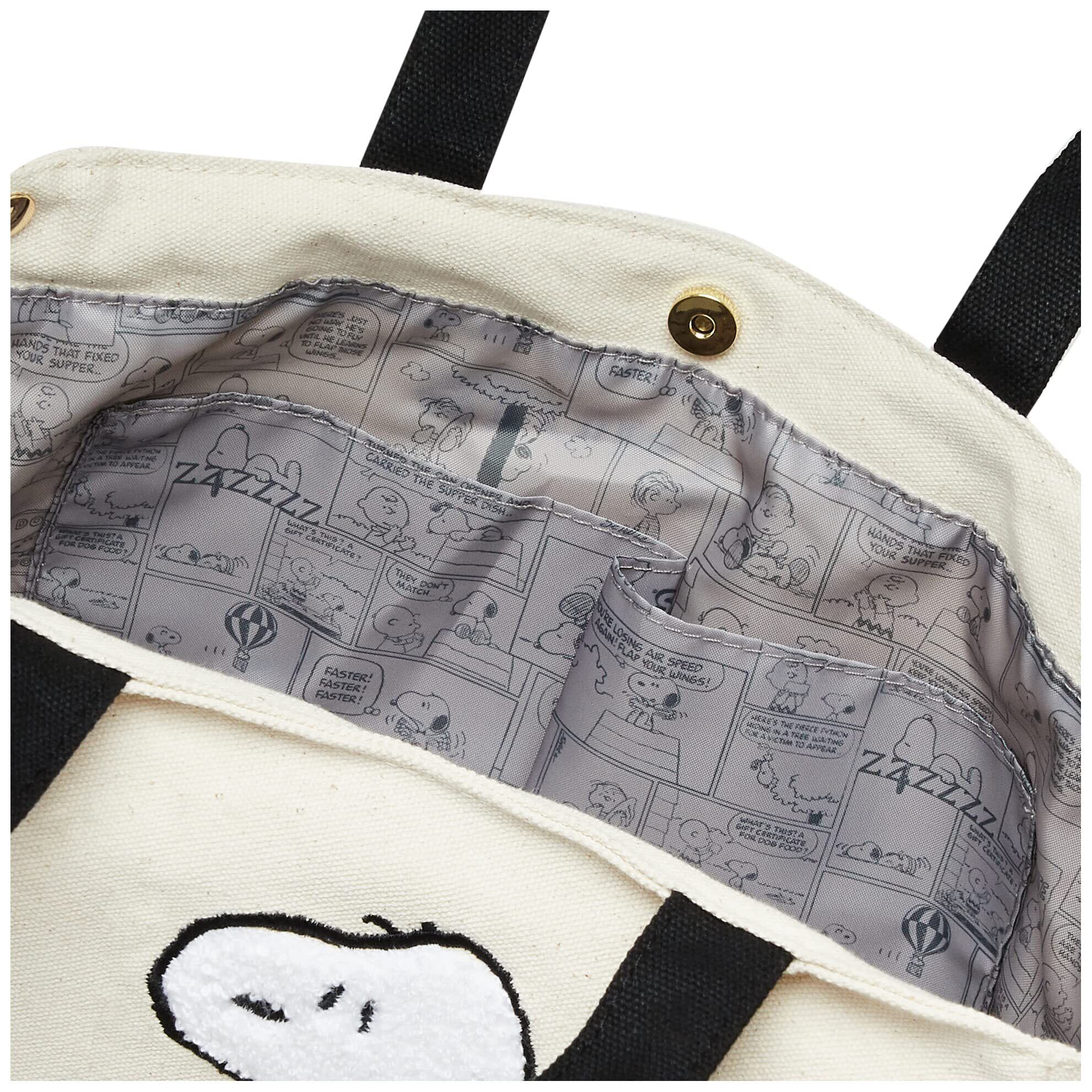 普段使いにおすすめなサイドボタンミニトートバッグ。バッグのサイドにボタンがついた帆布生地のカジュアルなバッグです。サイドボタンをつけたままでも外した状態でもお好みの形に変えてご使用いただけるおしゃれなバッグ。バッグ横についたスヌーピーのタグや内装がスヌーピーの総柄になっているのもかわいい! マチも広く、容量も約4Lと収納力も抜群。