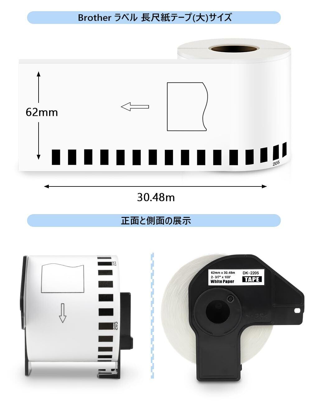 長尺紙テープ(大) 62mmx30.48m DK-2205 DK 2205 感熱ステッカー紙 プレカットなし ラベルプリンター QL-800 QL-820NWB QL-700 QL-550 QL-720NW QL-650TD 5ロールセット、ブラザーBrotherと互換性のある DKラベル 合計152.4メートル