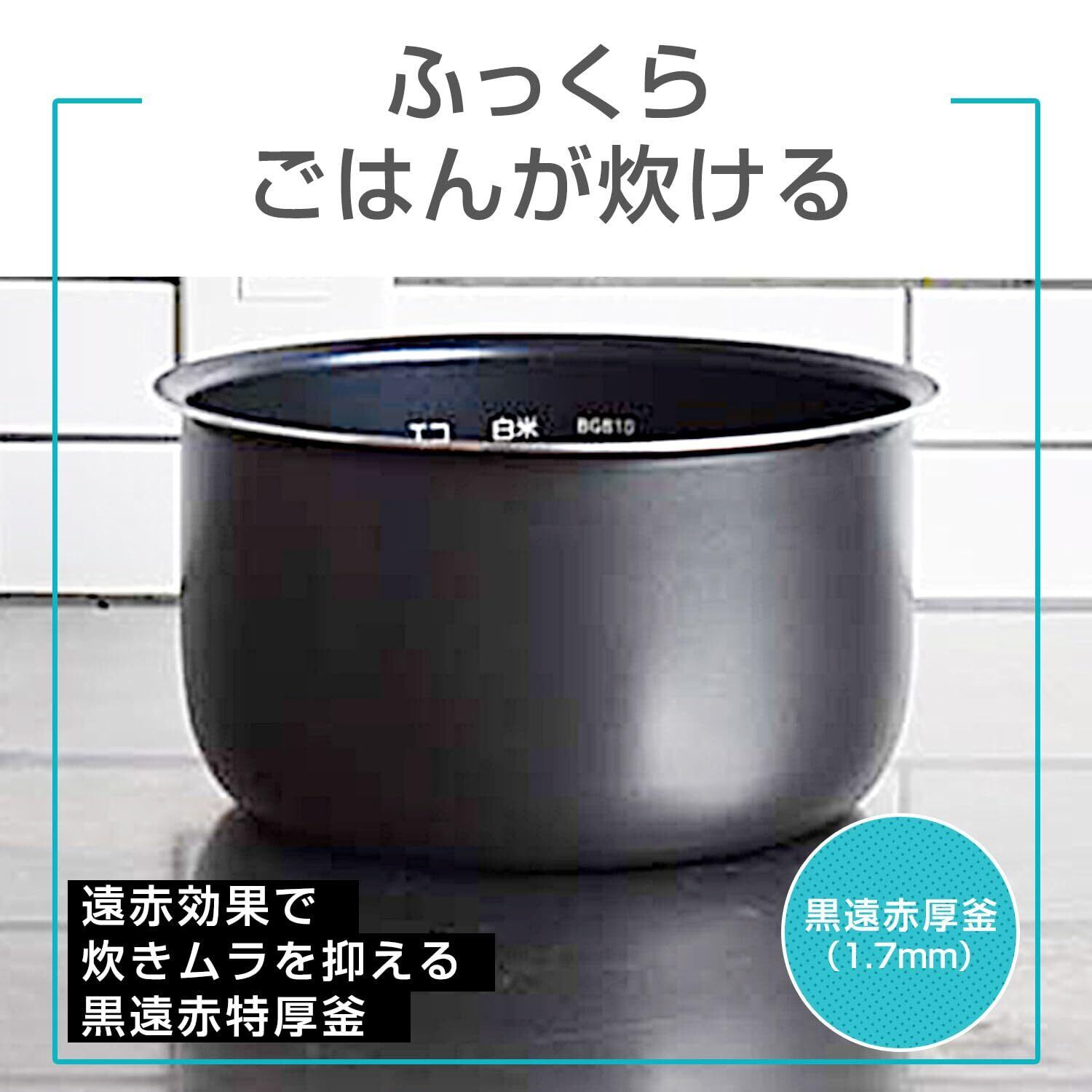 ・ふっくらごはんが炊ける「黒遠赤厚釜(1.7mm)」…遠赤効果の高い黒厚釜で炊きムラを抑え、ふっくらおいしいごはんを炊きあげます。