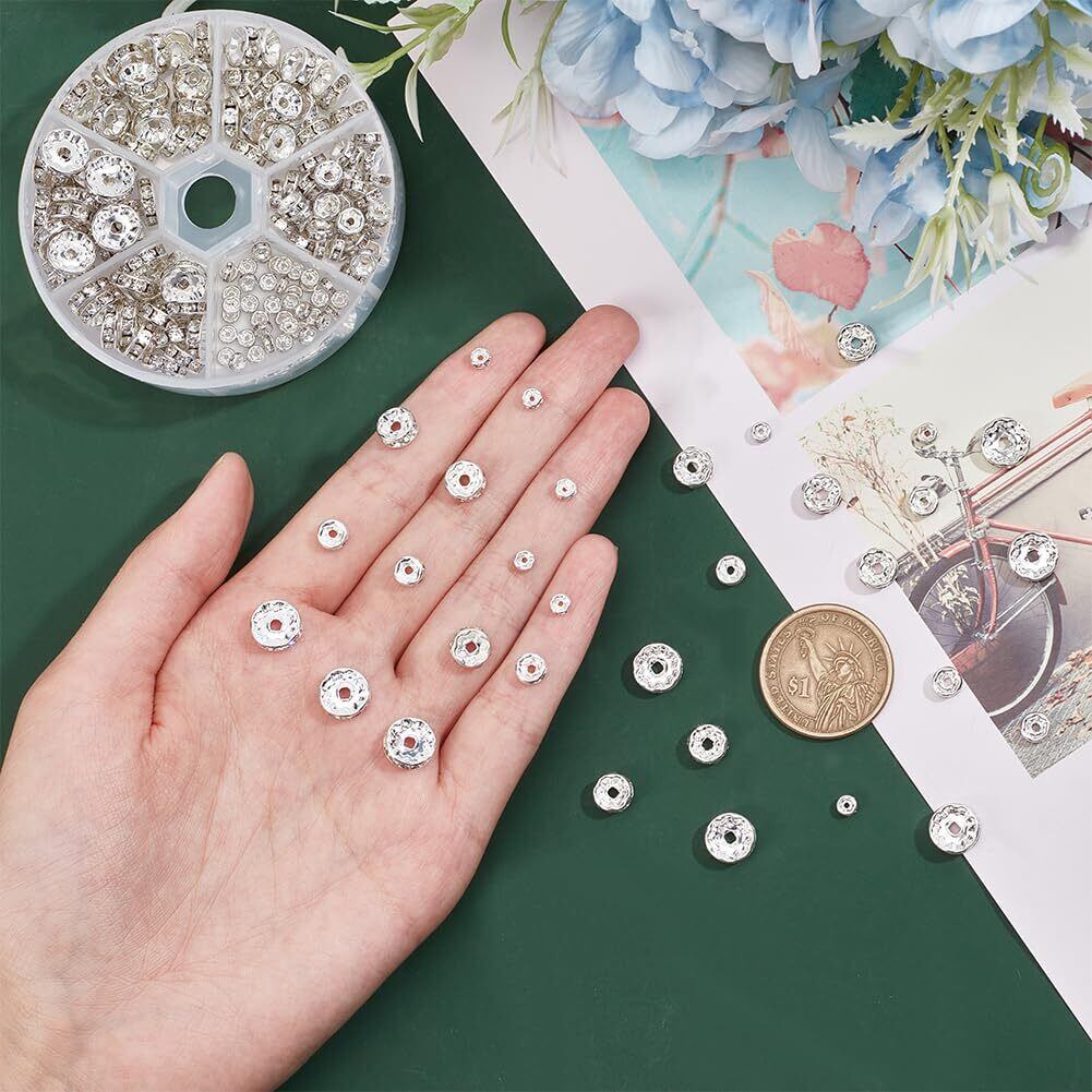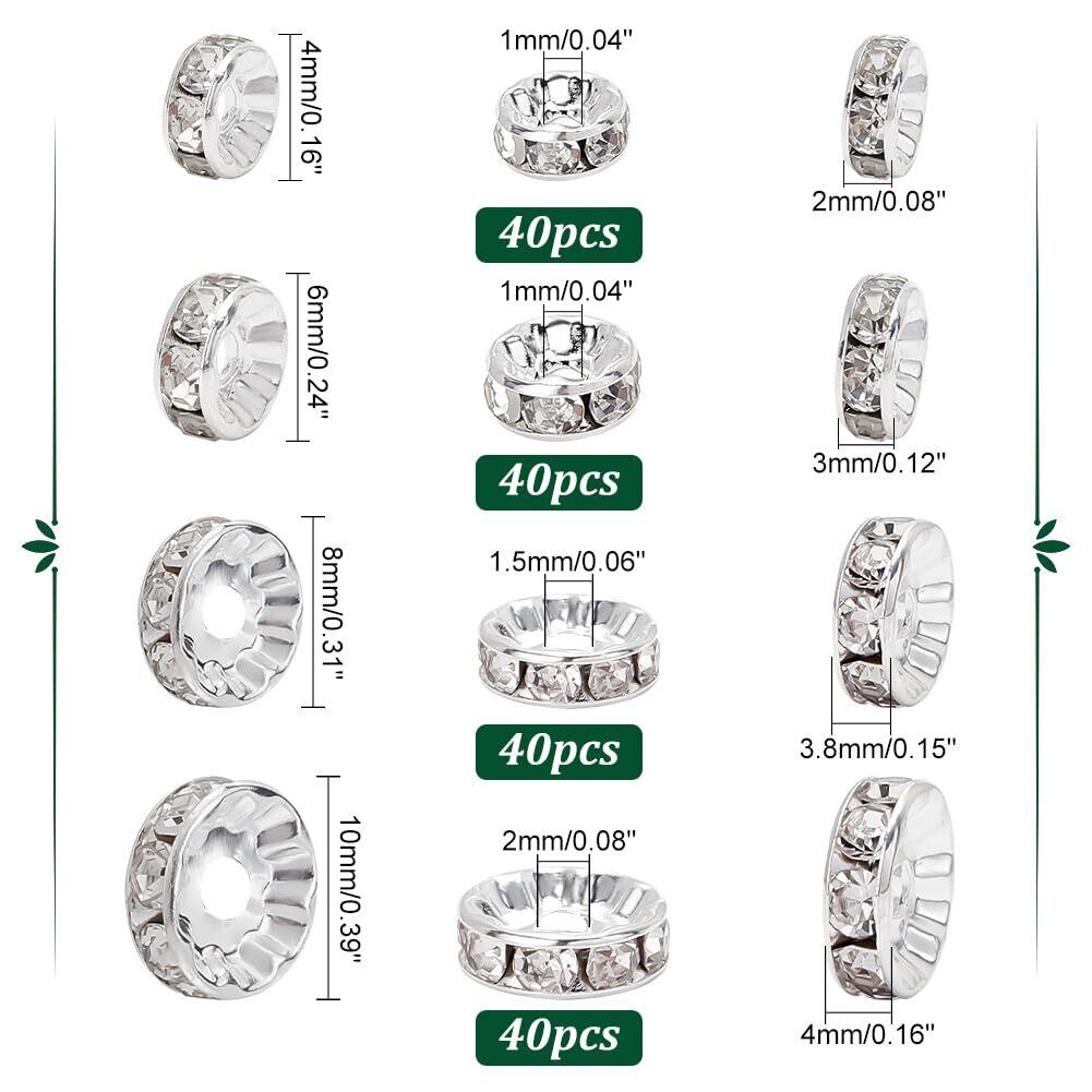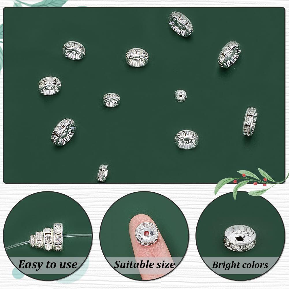PH PandaHall 約160個/箱 ロンデル 4/6/8/10mm 平型ロンデル 真鍮 ラインストーン付き スペーサービーズ メタル ビーズ アクセサリーパーツ ジュエリー 手芸用品 クラフト用品 手作り素材 材料 シルバー