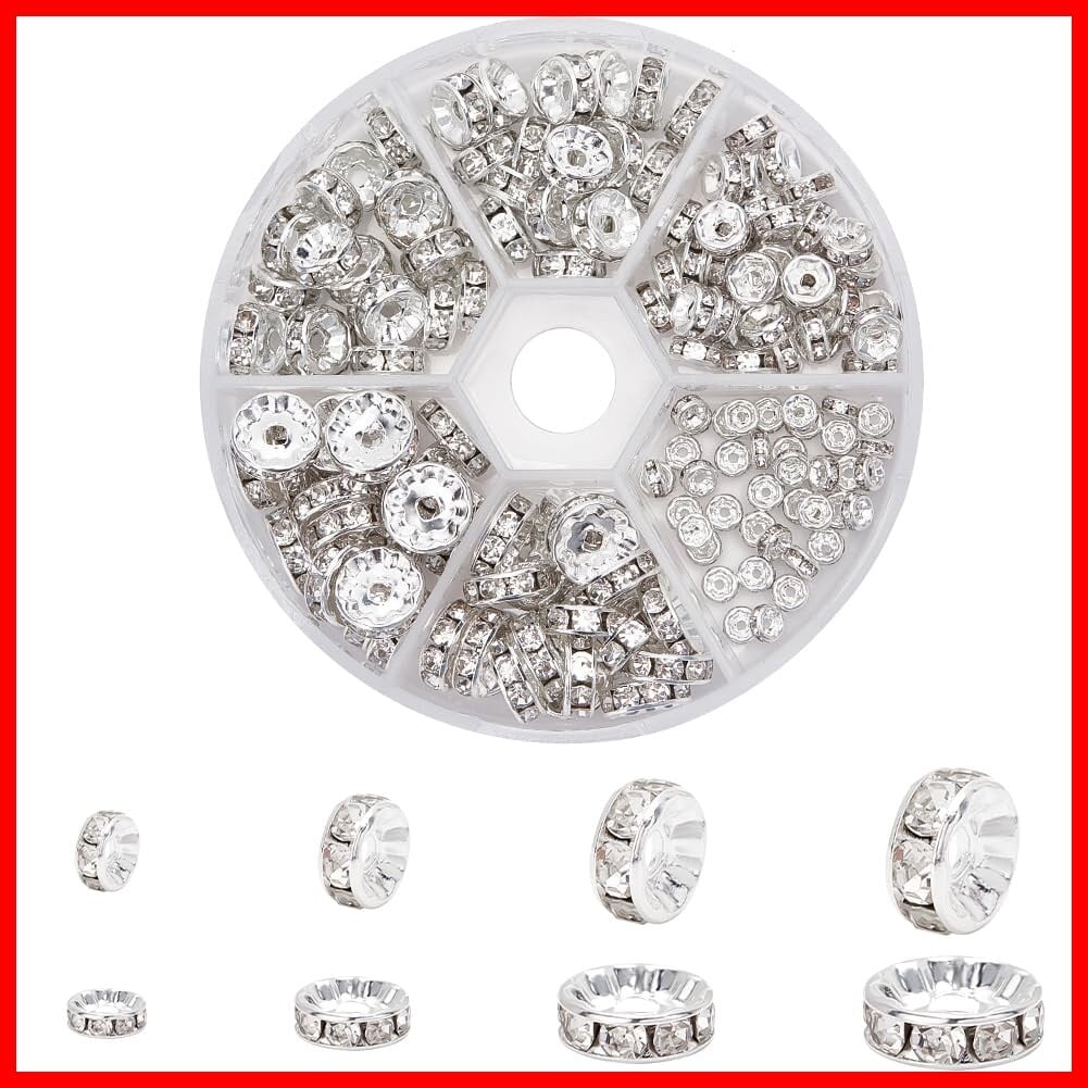PH PandaHall 約160個/箱 ロンデル 4/6/8/10mm 平型ロンデル 真鍮 ラインストーン付き スペーサービーズ メタル ビーズ アクセサリーパーツ ジュエリー 手芸用品 クラフト用品 手作り素材 材料 シルバー | hananoki