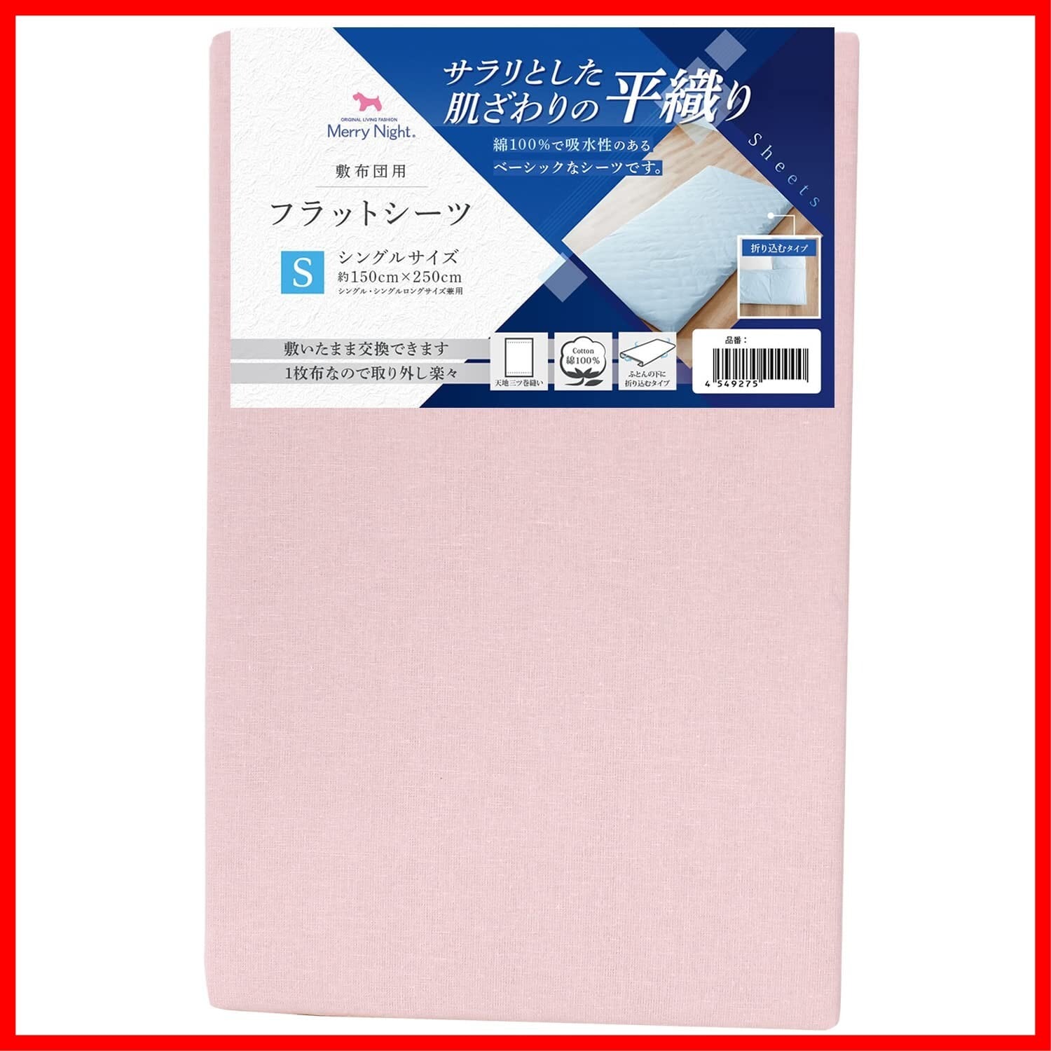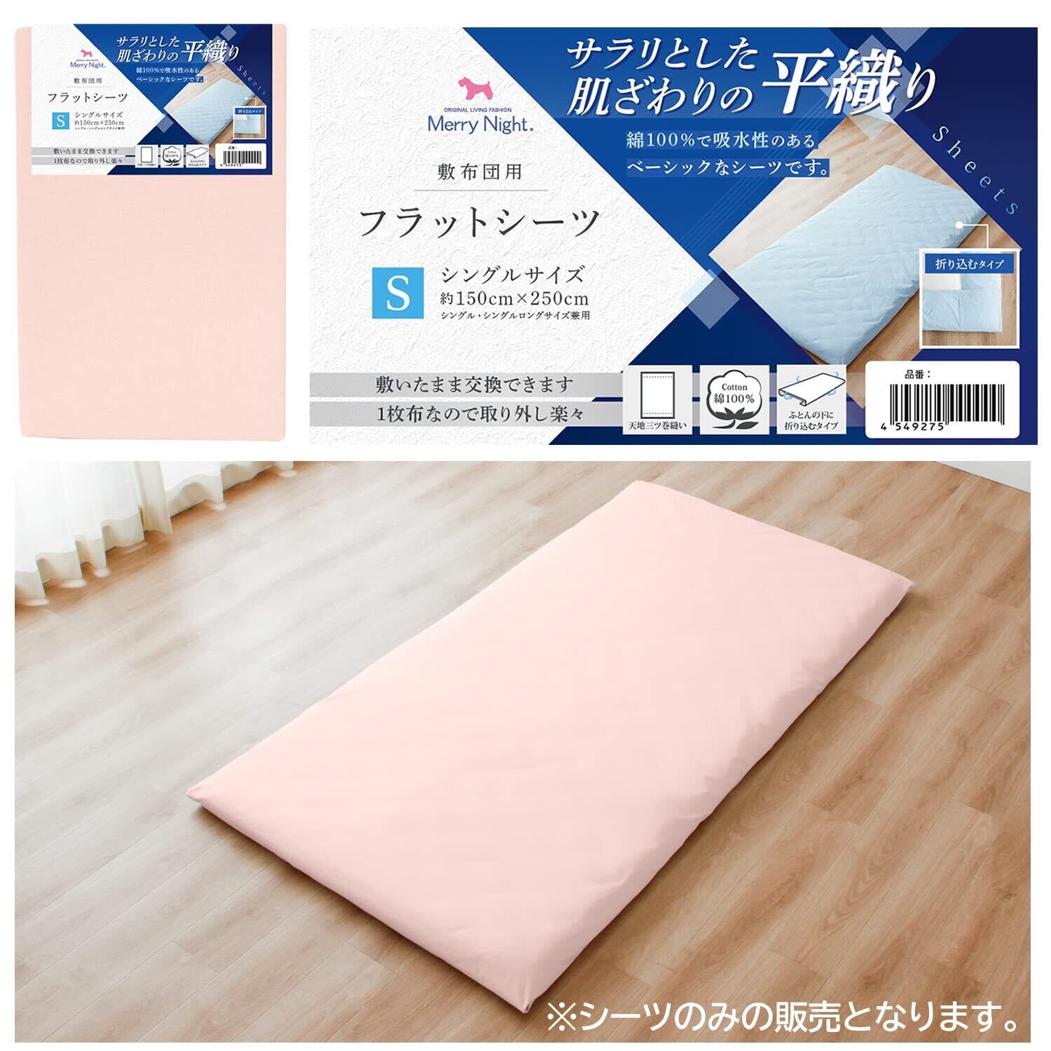 メリーナイト シーツ フラットシーツ 平織生地 ピンク 敷布団用 シングル 約150×250cm 綿100% ベーシック生地 サラリとした肌ざわり オールシーズン 洗える 372001-16