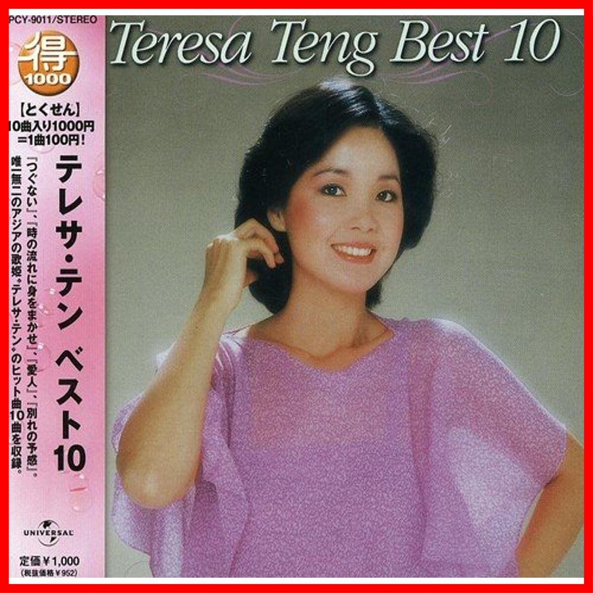 10曲入り1000円の初回生産限定ベスト盤`得1000`シリーズ(全25タイトル)。本作はテレサ・テン編。「つぐない」「時の流れに身をまかせ」「愛人」「別れの予感」他を収録。 (C)RS