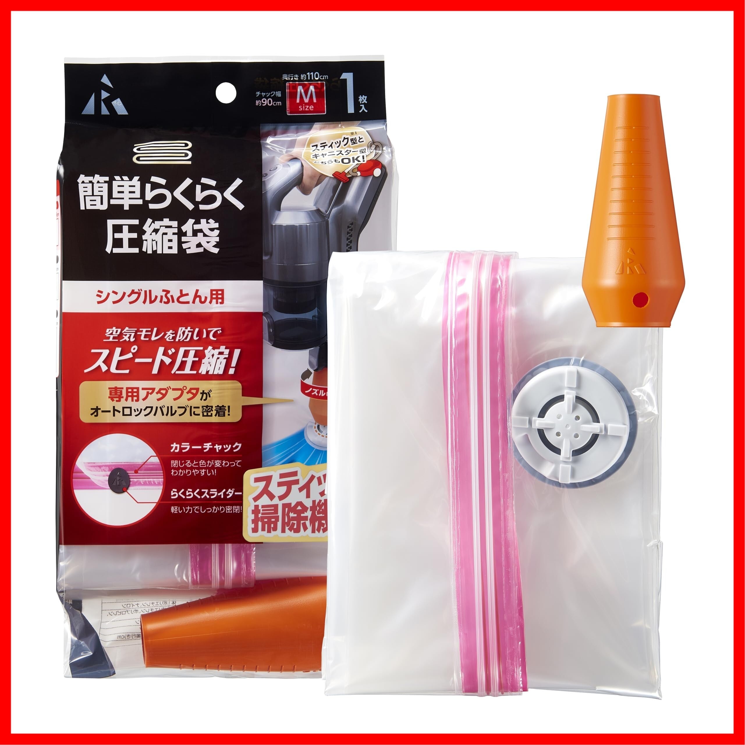 アール(R) 簡単らくらく圧縮袋 (アダプタ付き/スティック型 キャニスター型 対応) 空気モレを防いでスピード圧縮 (シングルふとん用 1P / バルブ式) 透明無地 (90×110cm) KR-001