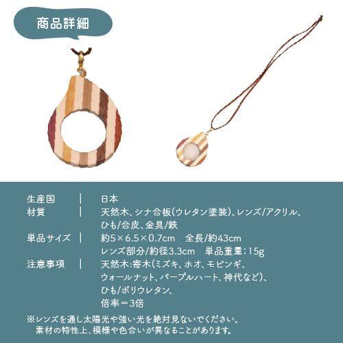 【注意事項】天然木:寄木/ミズキ、ホオ、モビンギ、ウォールナット、パープルハート、神代など)、ひも/ポリウレタン、倍率=3倍 ※レンズを通し太陽光や強い光を絶対見ないでください。素材の特性上、模様や色合いが異なることがあります。【生産国】日本