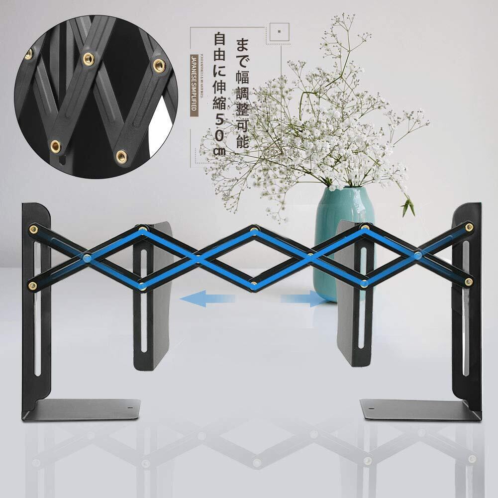 伸縮可能なブックエンド:本、CDまたは雑誌の量に合わせて、幅を10cm-50cmまで調節できる便利な伸縮式ブックスタンドです。二枚仕切り板があり、本を種類別または用途別に収納でき、取り出すときもとても便利です。