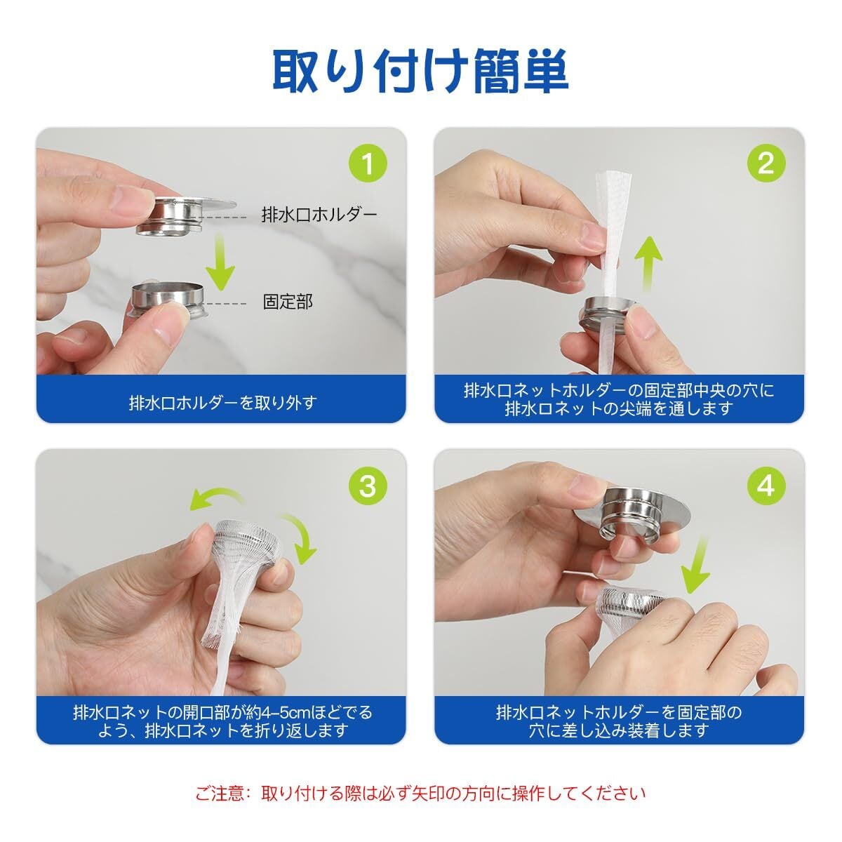 【商品仕様】:材質:ステンレス製、髪の毛キャッチャーX1個;固定部X1個;髪の毛キャッチャーネットX 100枚 (口径3.5-4.5 cmの排水口に対応して) 水切りネットを取り付ける際は固定部をしっかり持ち、落下して排水口に滑り込むことで排水口が塞がる恐れがあるので注意してください。