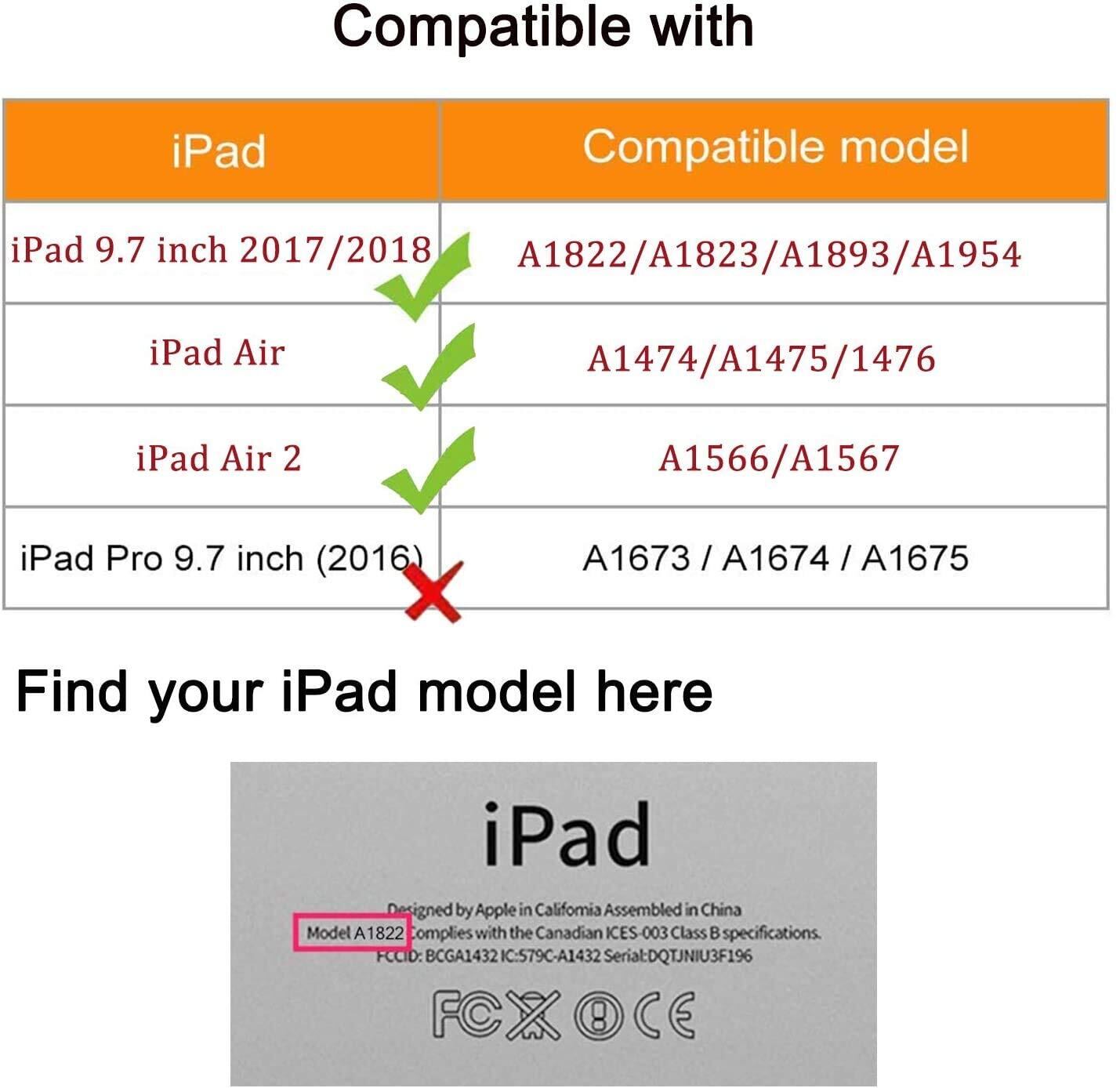 ➤【適用機種】 New iPad 2018 (モデル番号:A1954)/iPad 2017 (モデル番号: A1822、A1823)/ipad air(モデル番号:A1474、A1475、A1476))/ipad air2(モデル番号:A1566、A1567)。ご購入前に必ず裏面にモデル番号を確認してください。