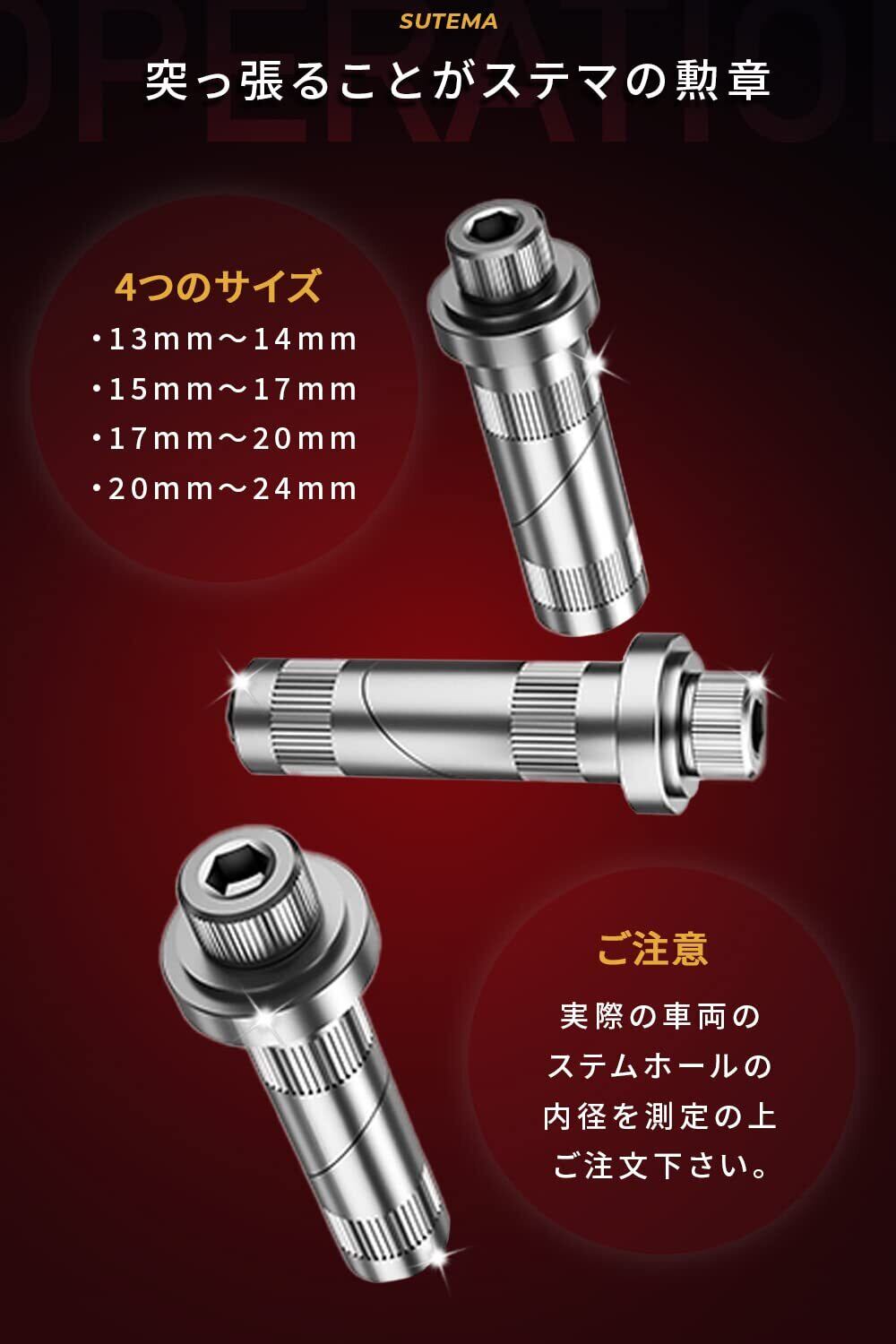【サイズ】 サイズは13~14mm/15~17mm/18~21mmの3サイズございます。ご購入前に実車のステムホールの内径を必ず測定し、サイズ範囲のバリエーションを選択して下さい。