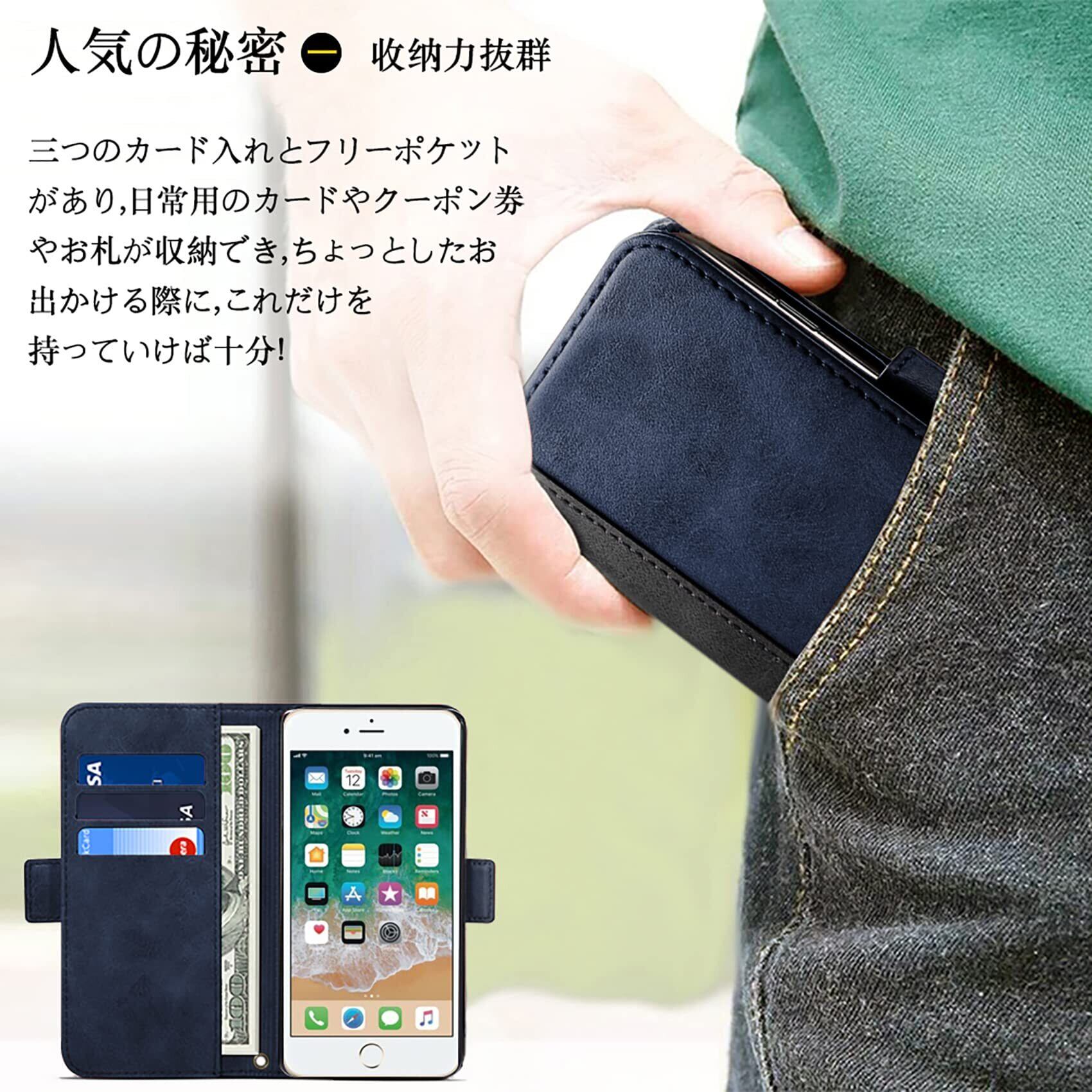 機能性 横置きスタンド機能が付いて、好きな角度で動画鑑賞や読書などを楽しめます。ブック型ケースとして、内側には三つのカード入れとフリーポケットがつき、名刺や定期券の収納に優れているiPhone se 第3世代 手帳型ケースです。