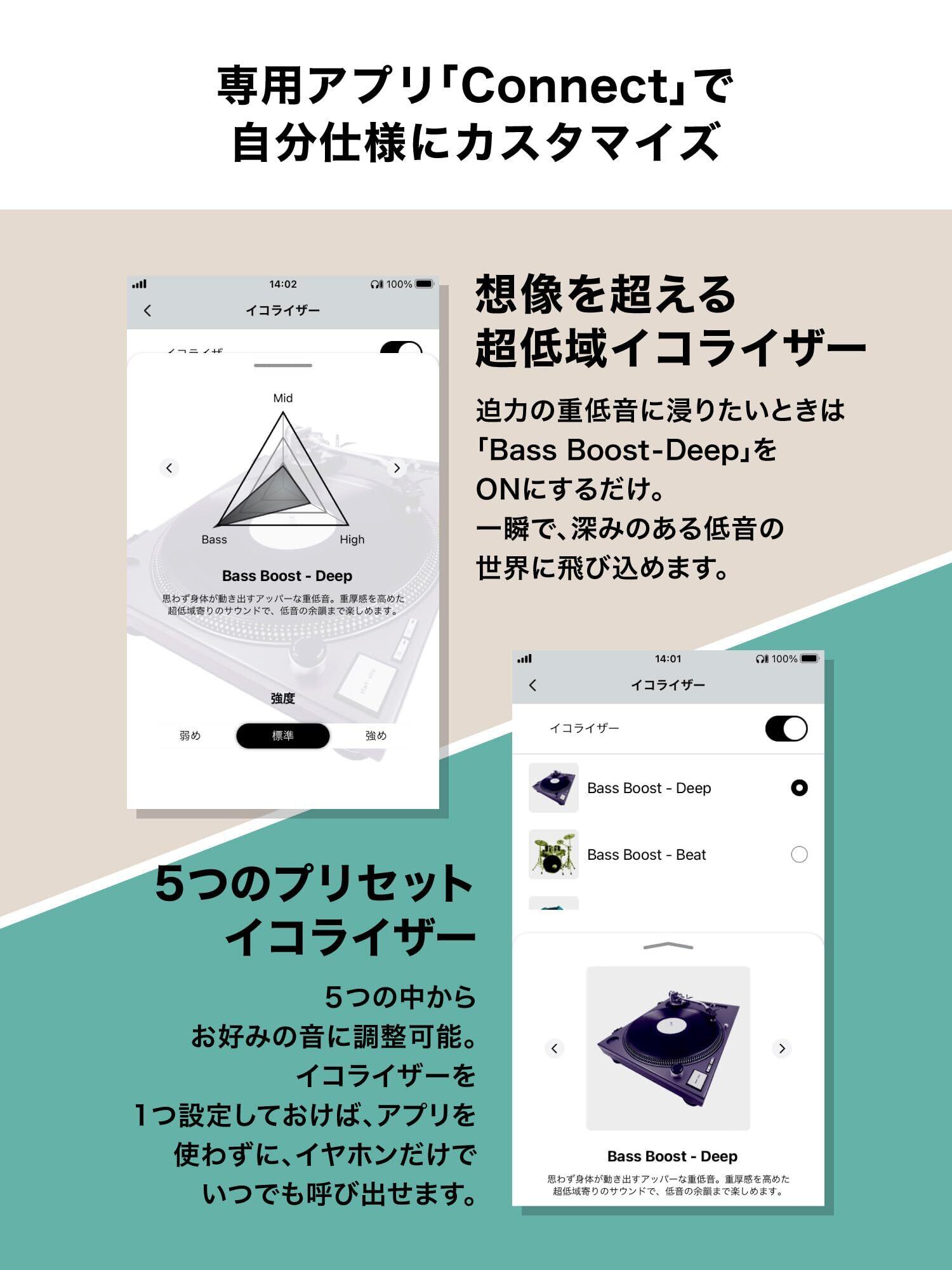 想像を超える、超低域イコライザー:迫力の重低音に浸りたいときは、専用プリセットイコライザー「Bass Boost - Deep」をON にするだけ。通常のイコライザー調整範囲よりさらに低い音域の「超低域」を拡張することができます。小さなイヤホンからは想像できない、深みのある低音の世界に飛び込めます。