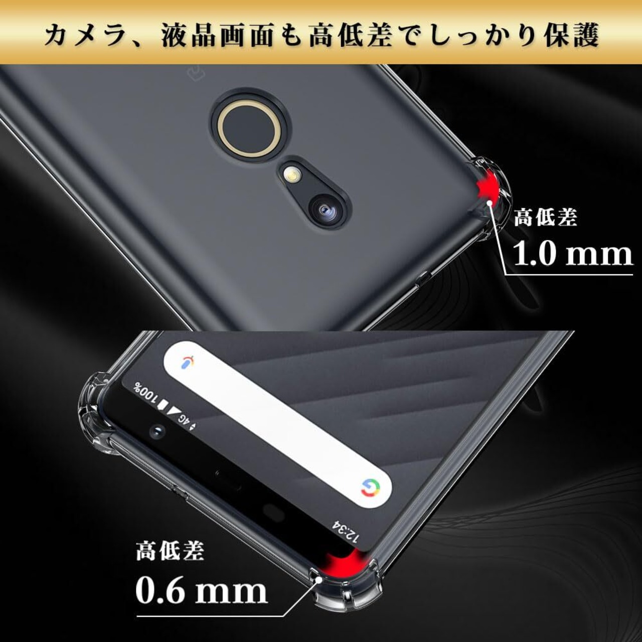 【カメラ、液晶画面は浮かせて保護】スマホを机などの平面に置いた場合に、液晶画面やカメラレンズが接触してできるキズが最小限に抑えられるよう、表側(液晶画面側)は0.6mmの、裏側(背面側)は1.0mmの高低差をつけ、浮かせることで傷や摩擦からガードします。