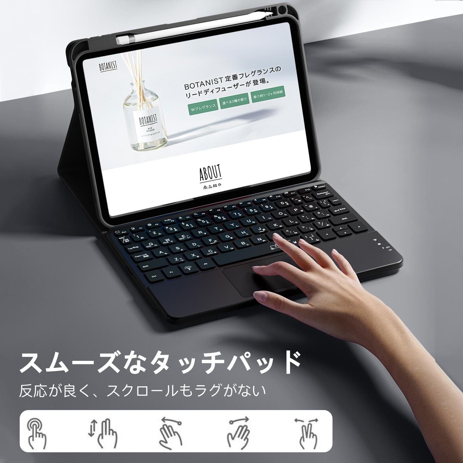 【JIS配列の日本語キーボード】JIS規格準拠の日本語配列で、かな入力や英語入力も対応。12種類のマルチメディアキーを搭載し、音量調整やプレーヤー操作も簡単!トラックパッドが付属し、ジェスチャ操作対応。ドキュメント編集やアプリ操作をスムーズに行えるため、作業効率が大幅アップ。※iPadOS 17.5以上が必要。