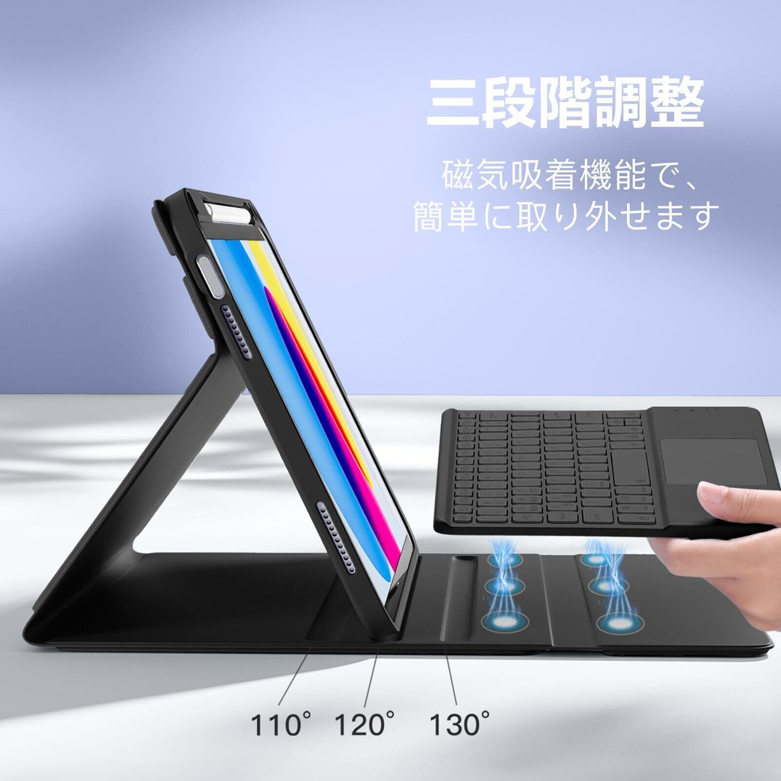【脱着式キーボード&便利なApple Pencil収納】 キーボードは脱着式で、強力なマグネット内蔵により安定して装着可能。Pencilホルダー付きで、ペンやアダプタをしっかり収納。持ち運びも便利!作業や動画視聴に合わせて自由に角度調整可能。様々なシーンで活躍!