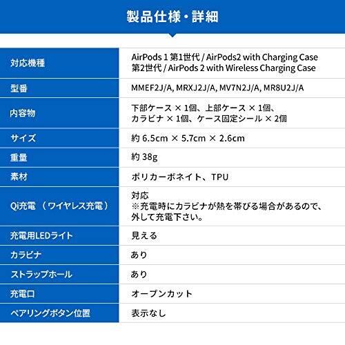【製品仕様】… ◆ 機種 : AirPods 1 第1世代 / AirPods2 with Charging Case 第2世代 / AirPods 2 with Wireless Charging Case ◆ 型番 : MMEF2J/A, MRXJ2J/A, MV7N2J/A, MR8U2J/A ◆ 内容物 : 下部ケース × 1個、上部ケース × 1個、カラビナ × 1個、ケース固定シール × 2個 ◆ サイズ : 約 6.5cm × 5.7cm × 2.6cm ◆ 重量 : 約 38g ◆ 素材 : ポリカーボネイト、TPU ◆ 型番 : VR_APACSPTAT_KK