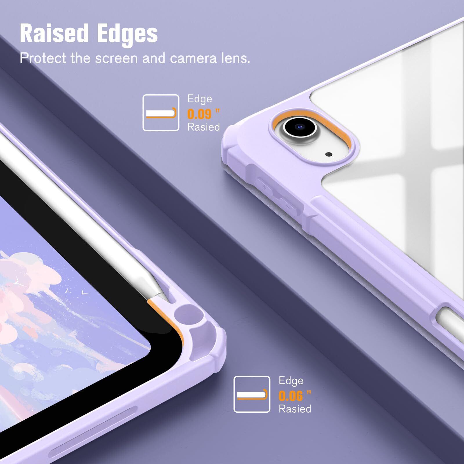 【材料・透明バックカバー】ケースの表面はPUレザー素材を利用して、軽量、超薄を備えます。ポリカーボネート素材を採用している透明バックカバーは汚れや傷つけなどを防止するだけでなく、iPad本体の色と美しさも活かせます。透明バックカバーの枠は柔軟な TPUを採用して、取り付けも簡単にできます。フロントカバー内部材質はマイクロファイバーで、摩擦によって発生する傷を抑え、液晶画面を保護しきれいに保ちます。(ご注意:透明バックカバーには保護用のフィルムがついていますので、ご使用前に保護フィルムを剥がしてください。)