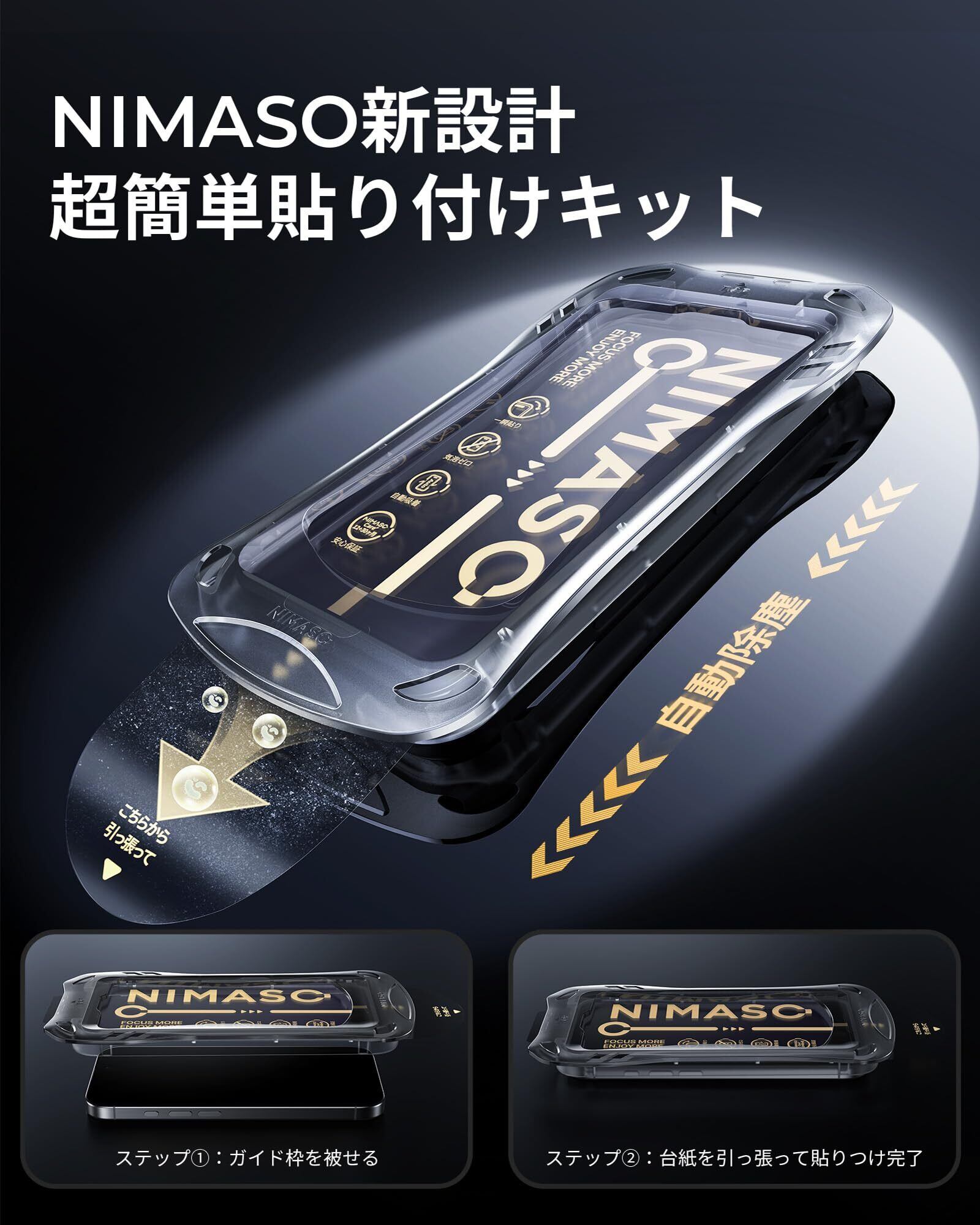 「2ステップOK・自動除塵」:NIMASO最新型の自動除塵ガイド枠が登場!!!被せる、引っ張る、たった2ステップで初心者でも簡単に貼り付けができます。フィルムも自然と吸着する構造になっているため、静電気を利用してスクリーン上のホコリが引き出せ、気泡が入りにくく、完璧な貼り付けが可能、貼付け時の失敗が大幅に軽減できます。