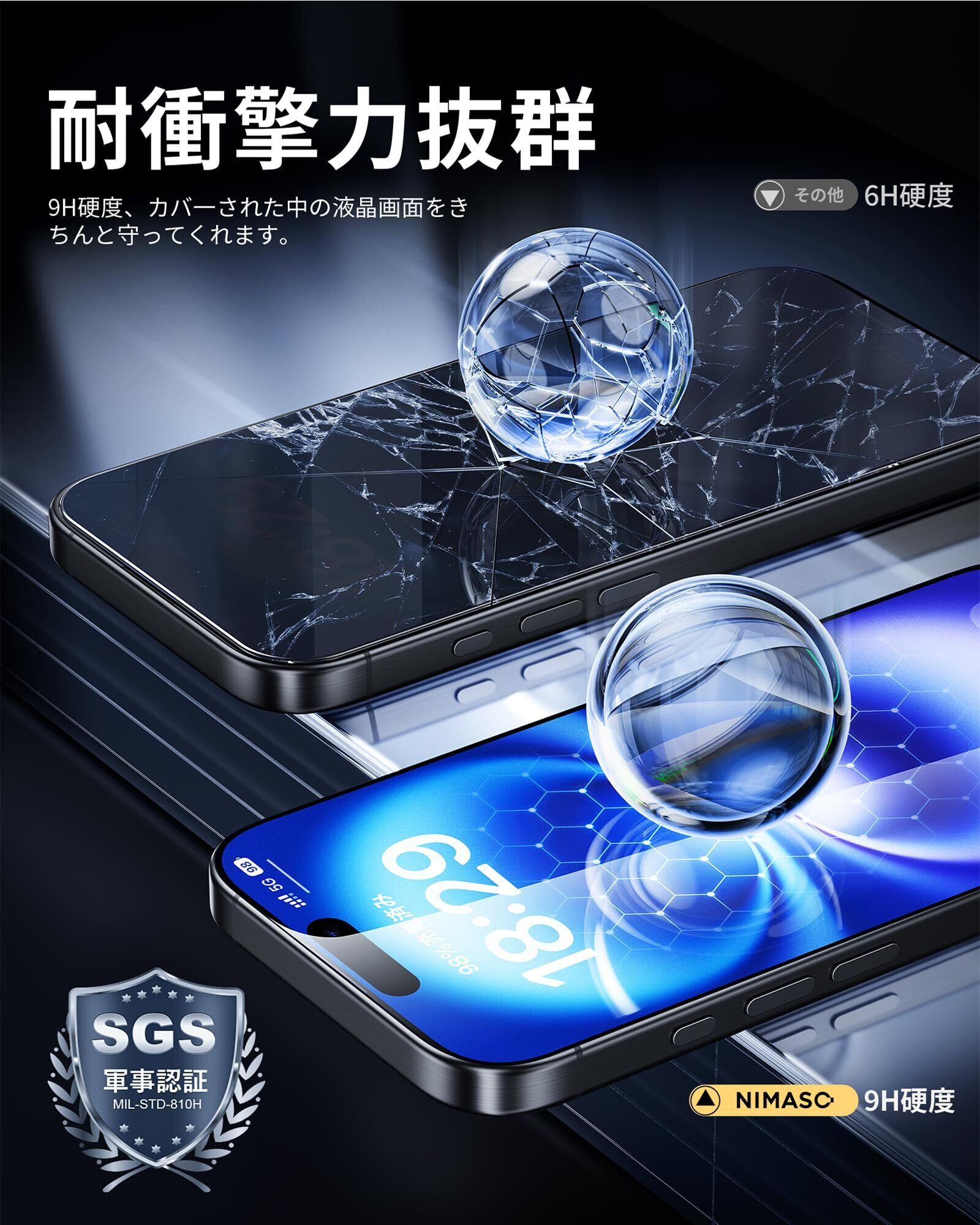 「米軍規格材質・飛散防止」米軍規格(認証番号:GZMR220702278001-1)の9H硬度ガラスを採用、鍵などの硬く鋭いものにぶつかっても傷が付きにくく、落下などの衝撃も最小限に抑えられ、アイフォン16の画面をしっかり保護します。また、飛散防止も加工されているので、ガラスフィルムが破損した場合でも破片が飛び散らず、スクリーンを保護しながら、破片による怪我のリスクも減らします。