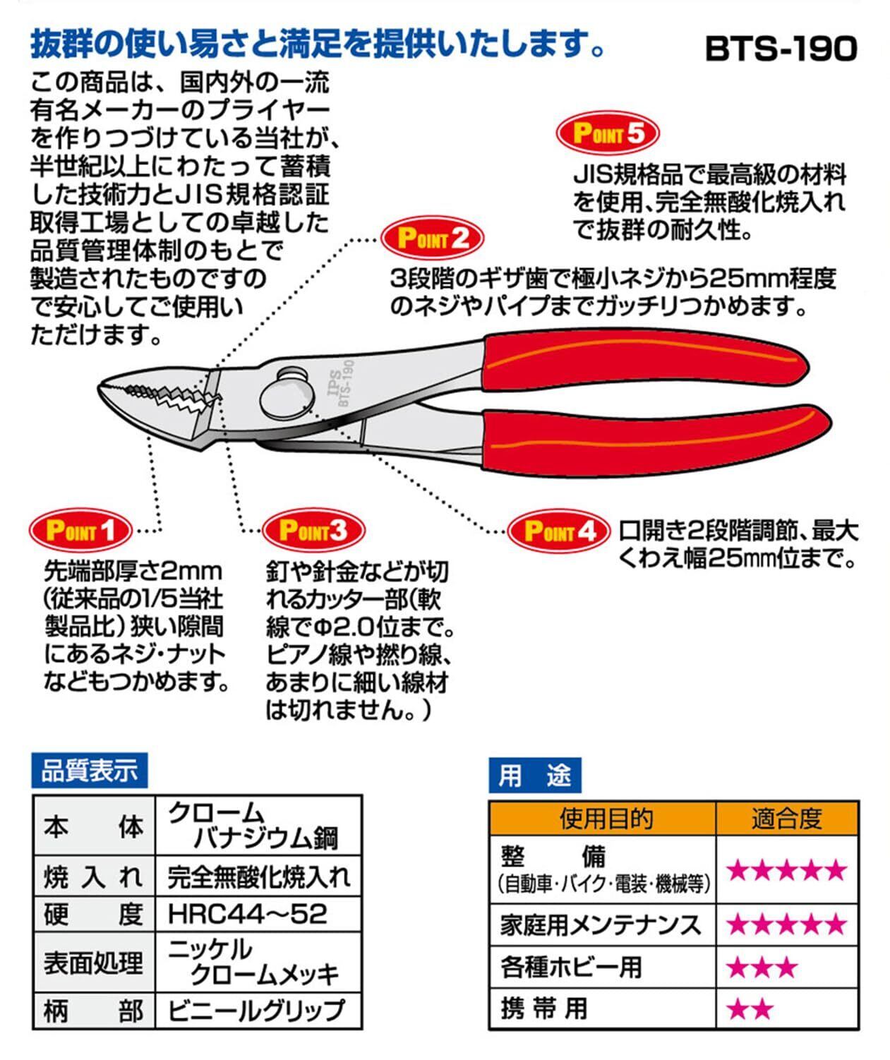 IPS アイピーエス BTS-190 極薄プライヤー ベントノーズ 190mm