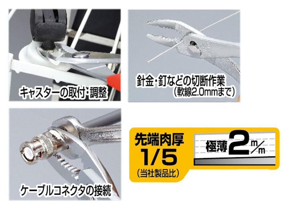 先端部厚さ2mm(従来の1/5当社製品比)狭い隙間にあるネジ・ナットなどもつかめます。※キャスターの取り付け・調節、ケーブルコネクタの接続などに適しております。