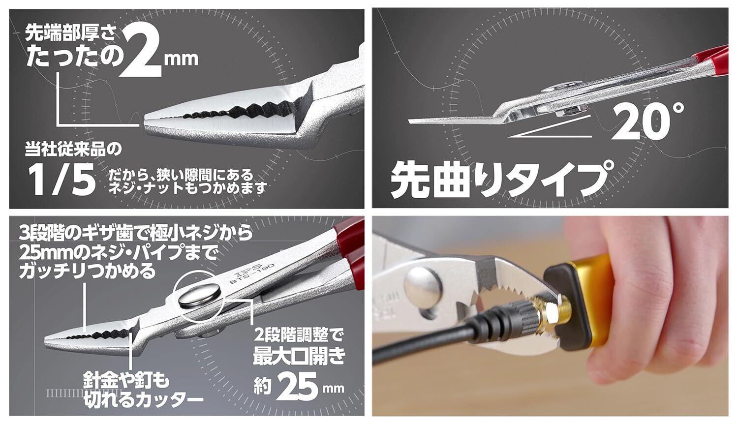 ●隙間に適した先端極薄加工。先端部分の薄さは従来比1/5(約2mm)。狭い隙間にあるネジ・ナットなども掴める