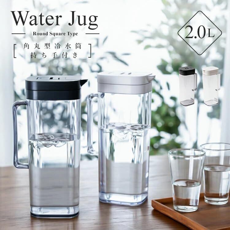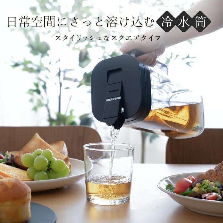 ワンプッシュオープン方式で手軽に注げる。冷蔵庫で横置きしても水漏れしない。スタイリッシュで、卓上にも映えるスクエア冷水筒。