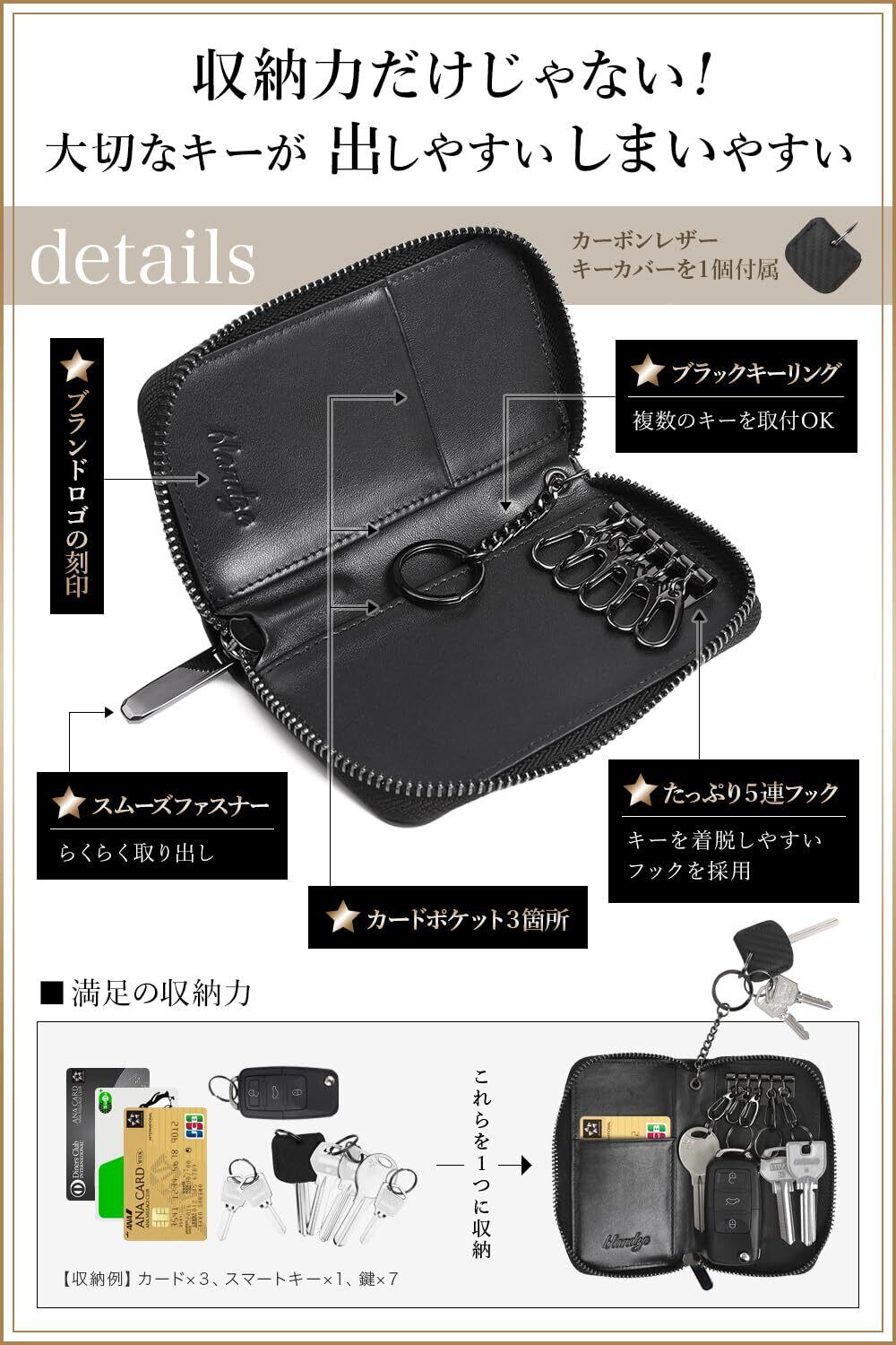 【 シックな内装 / 大容量の収納スペース / より使いやすく 】黒本革の落ち着いた内装。 革裏面にはゴールドの差し色で遊びを演出。 / 収納スペースがとても広いので大切なキーが 出しやすい しまいやすい。 / 5連フック + キーリング付きなので、キーをたっぷり収納。 大きく開くラウンドファスナーは出し入れスムーズ。 カードポケット3箇所。 SUICAなどの交通系ICカードを奥のポケットに入れて キーケースごとタッチして改札口を通れます。 キーカバー1個と大中小のリングが3個付属。