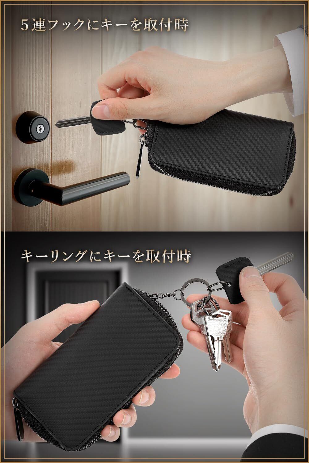 【 上品な高級感。 大人のキーケース 】 【 スペック 】表地:イタリア製カーボンレザー、外装:スムーズファスナー、内装:本革、サイズ:約12.7cm×約7.3cm×約2.0cm、重量:約98g 【 製品仕様 】キーフック×5、キーリング×1、カードポケット×3 (付属:キーカバー×1、リング×3) ※キーの形状や鍵の穴位置によっては直接フック(金具)に取付けできないとのお声がございますので、リングを3個お付けしました。 附属リングをキーに付けて、そのリングでフック(金具)に取り付けることができます。