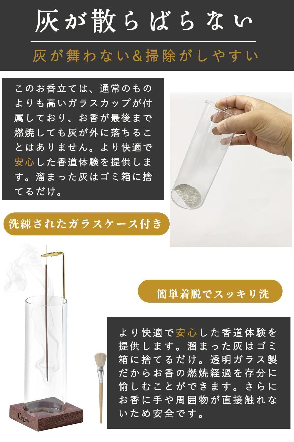 【灰が散らばらない】このお香立ては、通常のものよりも高いガラスカップが付属しており、お香が最後まで燃焼しても灰が外に落ちることはありません。より快適で安心した香道体験を提供します。溜まった灰はゴミ箱に捨てるだけ。透明ガラス製だからお香の燃焼経過を存分に愉しむことができます。さらにお香に手や周囲物が直接触れないため安全です。