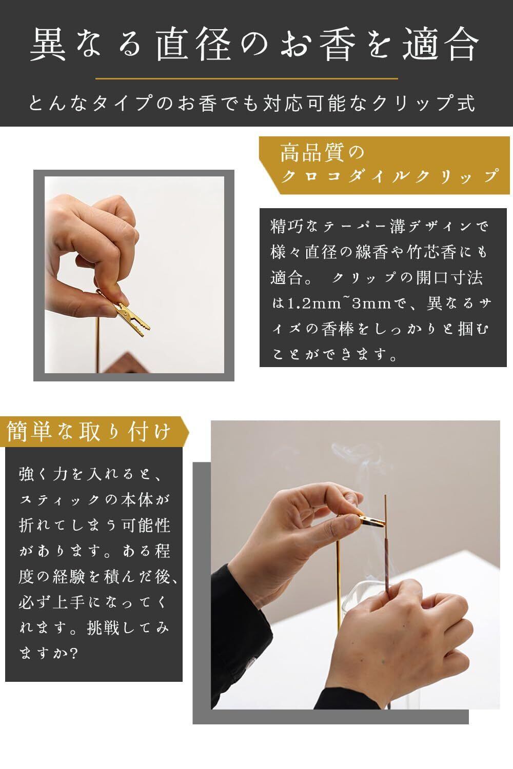【異なる直径のお香を適合】精巧なテーパー溝デザインで様々直径の線香や竹芯香にも適合。 クリップの開口寸法は1.2mm~3mmで、異なるサイズの香棒をしっかりと掴むことができます。強く力を入れると、スティックの本体が折れてしまう可能性があります。ある程度の経験を積んだ後、必ず上手になってくれます。挑戦してみますか?