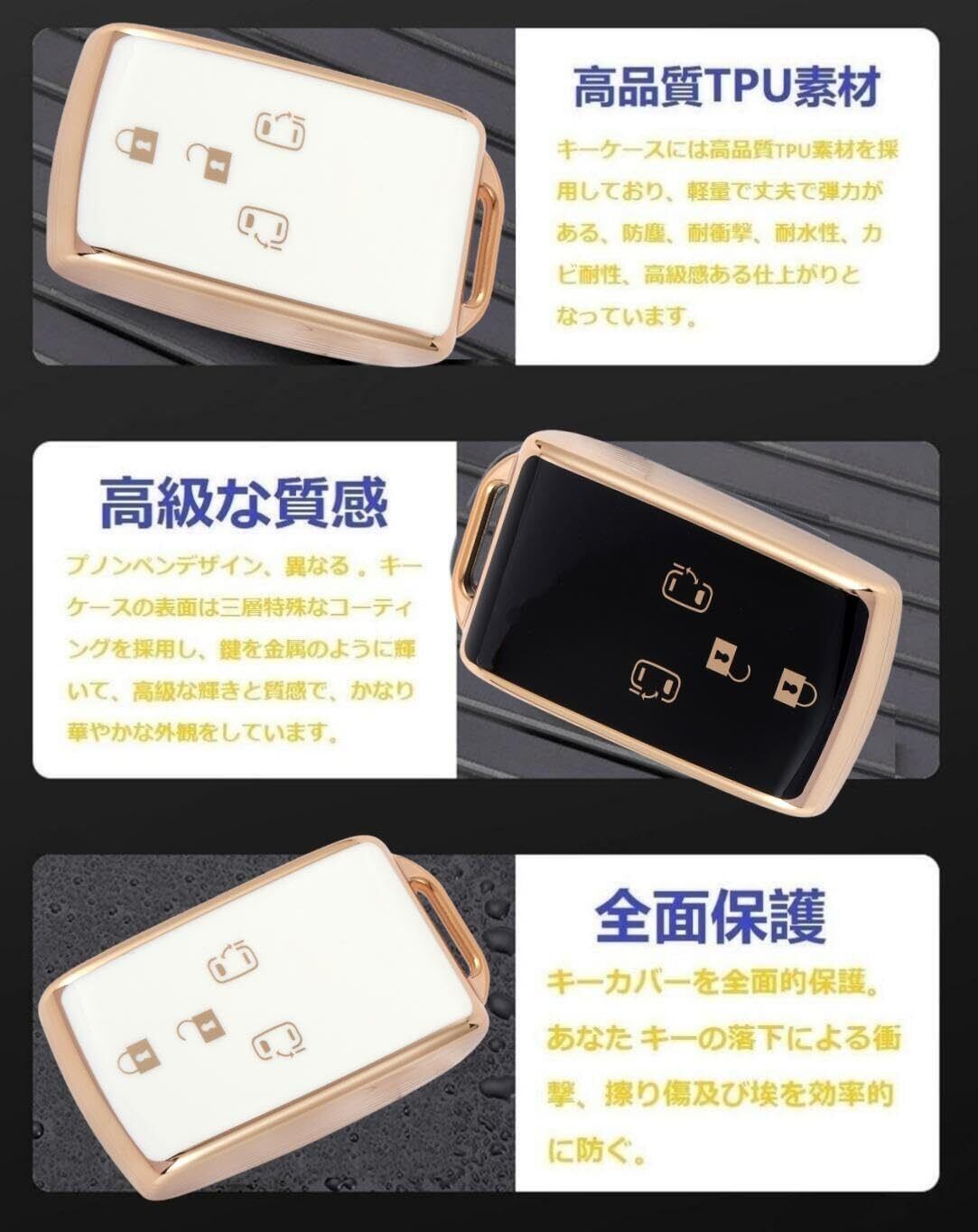 【高級な質感】キーケースの表面は三層特殊なコーティングを採用し、鍵を金属のように輝いて、高級な輝きと質感で、かなり華やかな外観をしています。本キーケースを取り付けるだけで愛車のスマートキーは高級車のキーに相応しく様変わりします。何気なくスマートキーを出すだけで周りの注目を集めます。愛車自慢のあなたにお勧めの逸品です。