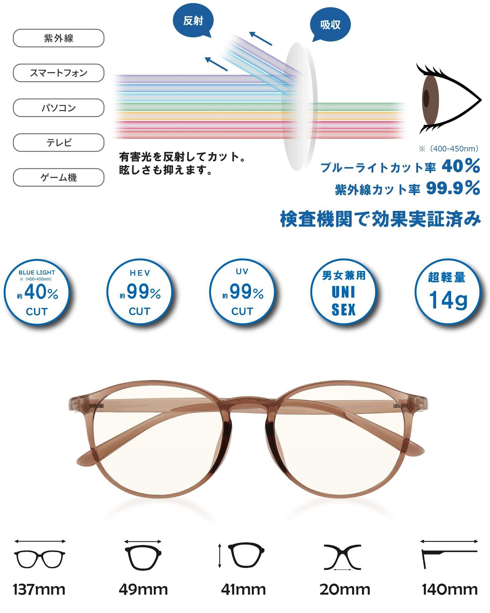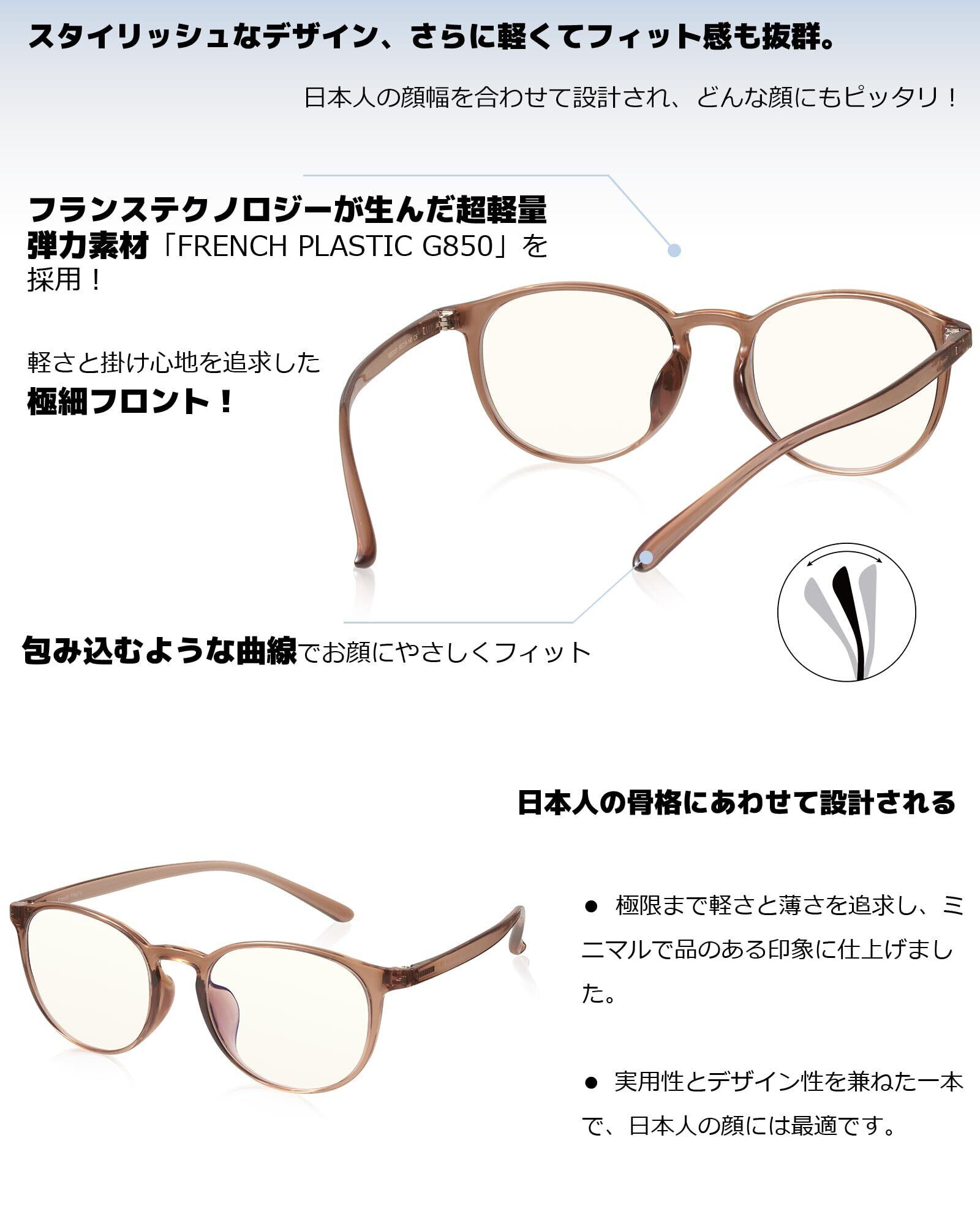 【素材構成】 『フレーム素材』:超軽量弾力「FRENCH PLASTIC G850」 『鼻パッドの形状』:フレーム一体型 『レンズ』:高品質プラスチック/ブルライトカット率40%/UVカット率99%/HEVカット率90%