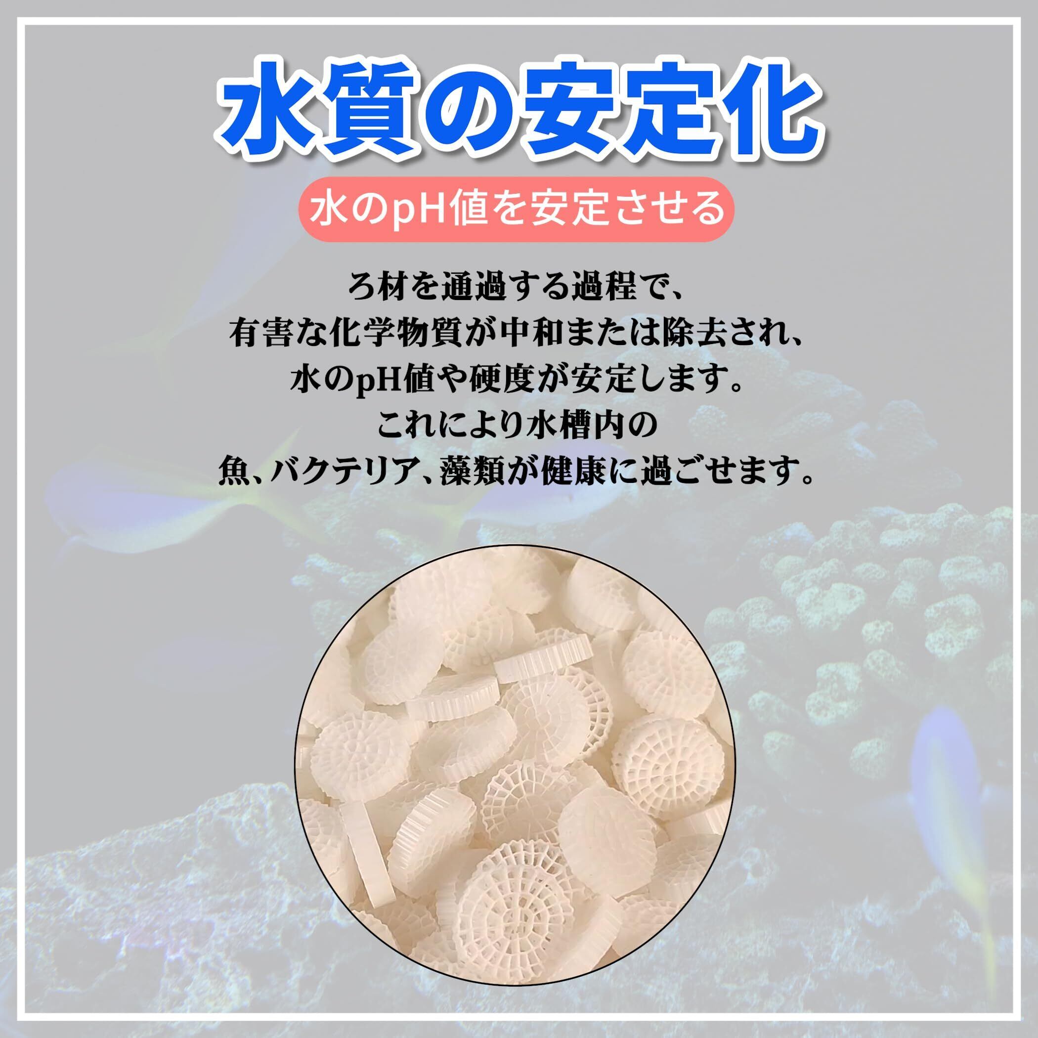 水質の安定化 : ろ材を通過する過程で、有害な化学物質が中和または除去され、水のpH値や硬度が安定します。これにより水槽内の魚、バクテリア、藻類が健康に過ごせます。