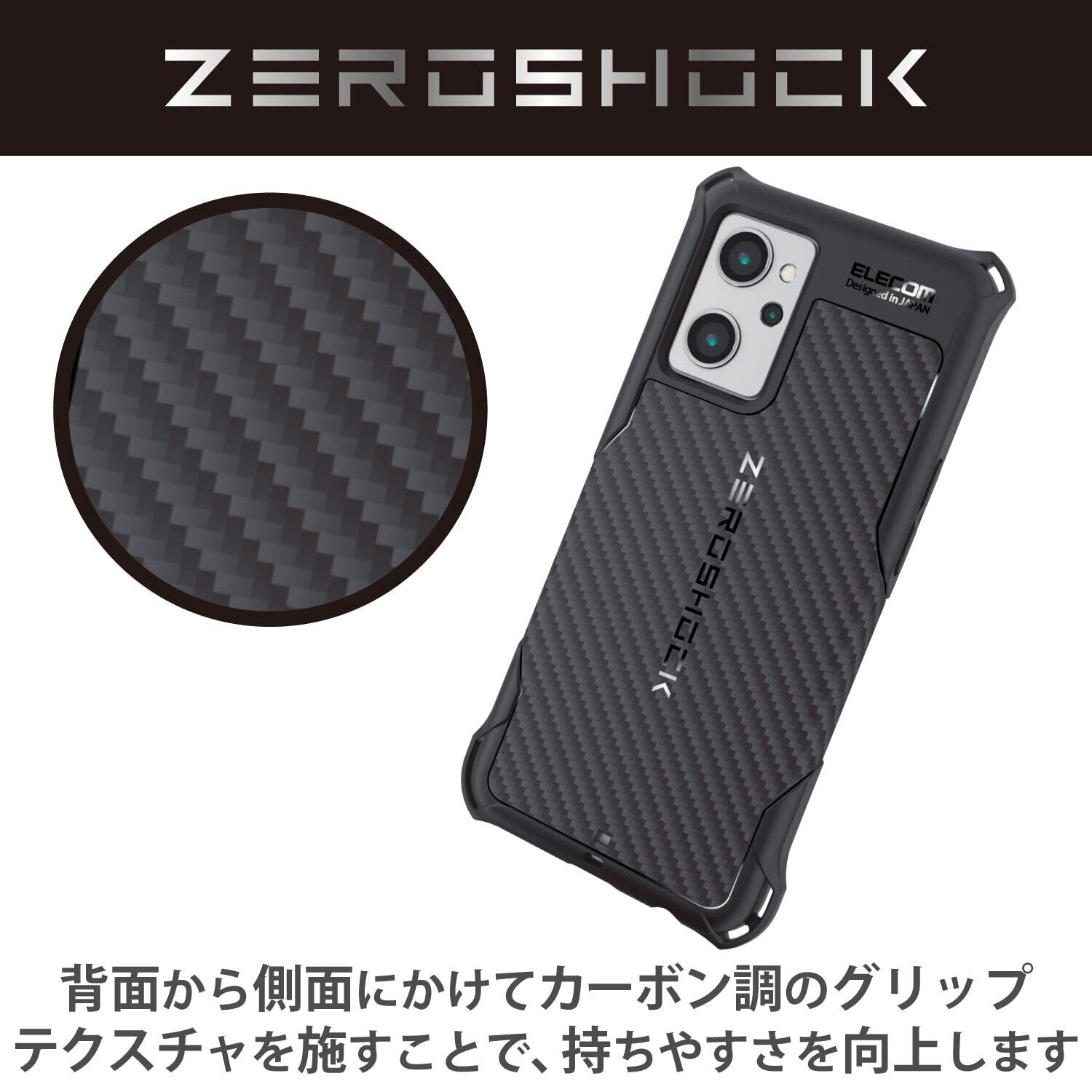 ケース背面から側面にかけてカーボン調のグリップテクスチャを施すことで、滑りにくくし持ちやすさを向上しています。