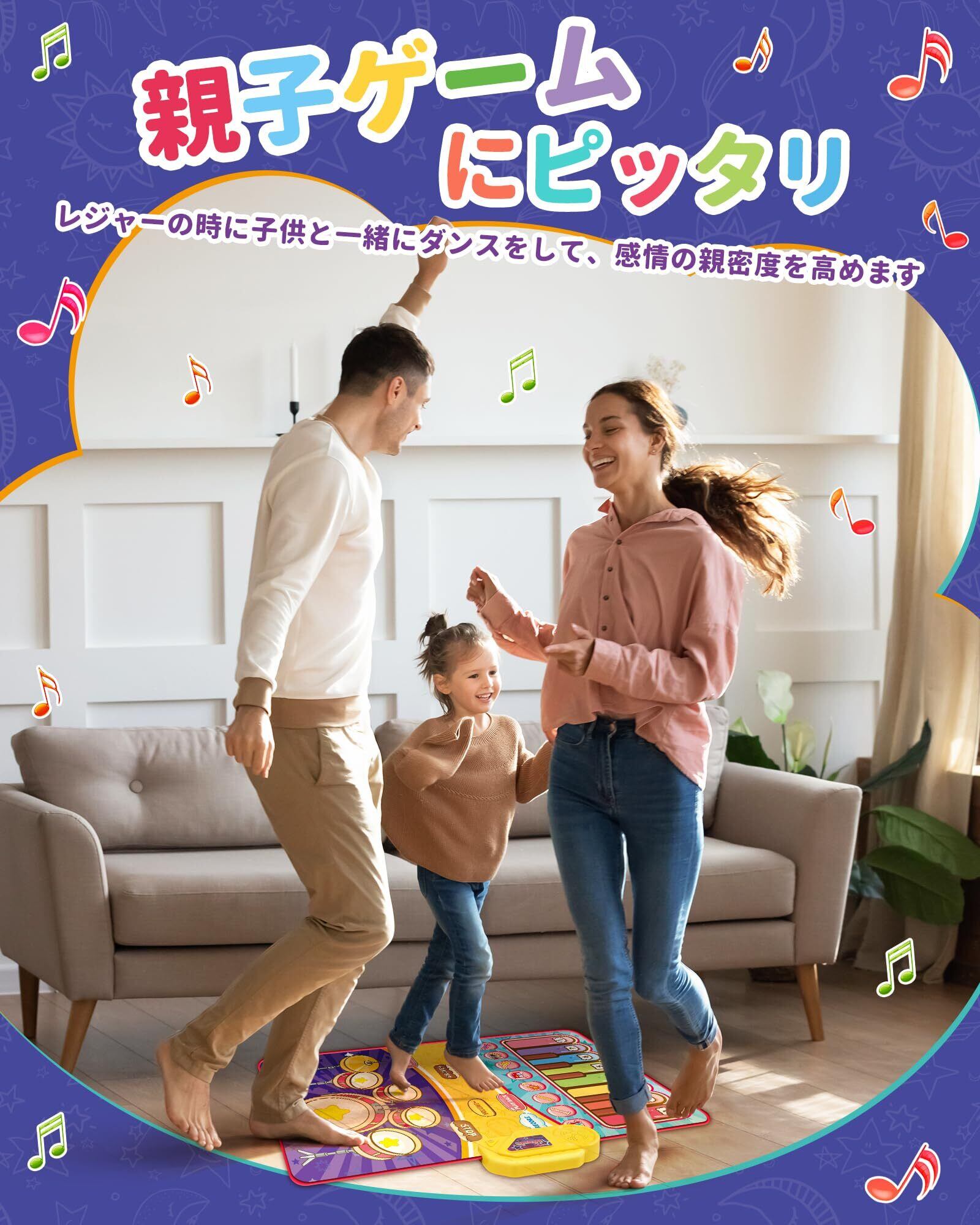 【2in1ピアノ&ドラムモード】ピアノの鍵盤とドラムの音が組み合わさったダンスマットで、13曲のメロディー、8つのピアノキーマット、8種類の楽器、音楽の調整、録音再生機能があります。友達や家族と一緒に音楽に合わせて踊って、音楽を全身で楽しんでもらえます。また、簡単なピアノやドラムの曲を演奏して、子供たちは音楽の魅力を感じることができます。