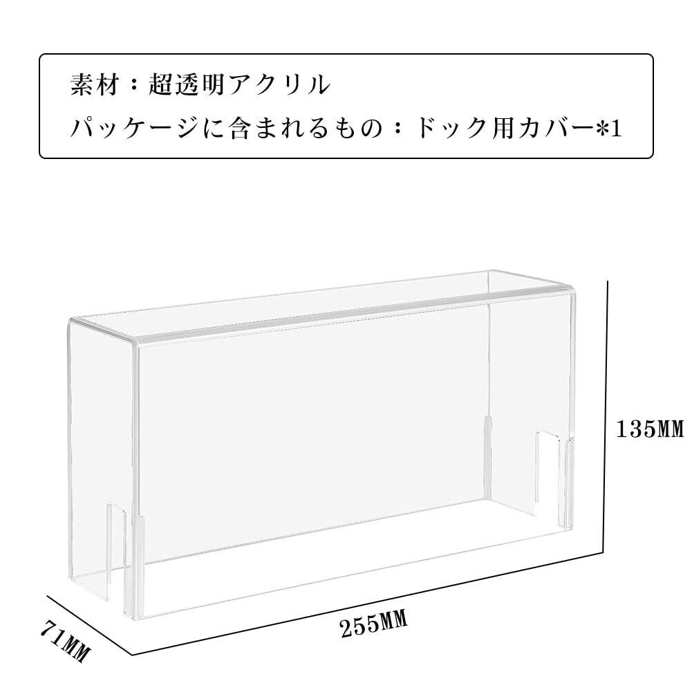 仕様:Nintendo Switchドック用カバー。素材:超透明アクリル。安全で無毒、加熱してもひび割れません。サイズ:255×71×135mm。3mmアクリル板(実際の厚さは約2.7mm)。カラー:透明。