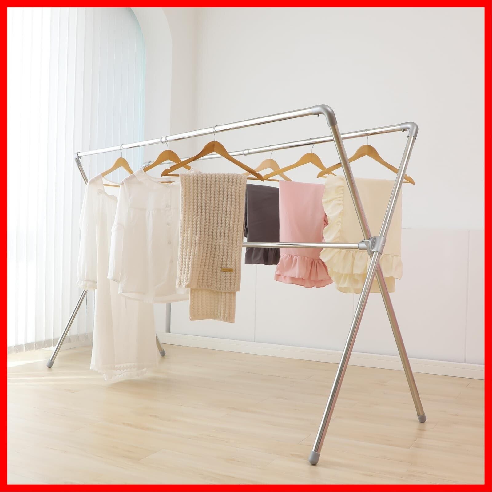 【丈夫でX型優れた安定性】物干しはX型構造を採用し、全体の安定性を有効的に高めています。布団干しはステンレスを使用し,丈夫で耐久性持ち、強風時でも転倒の心配がなく安定性を高めています。ステンレスは優れた防錆性能を備え、使用寿命を効果的に延ばできます。更に、アルミ合金接続部品、頑丈さ倍増!足にABS新素材を使用、安全で滑りにくく、移動時の騒音もありません。