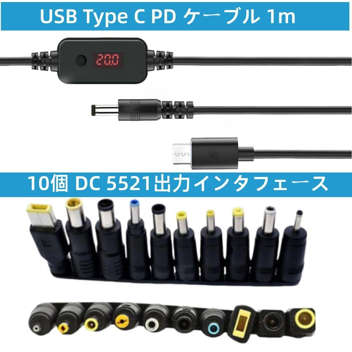 10in 1 USB Type C PD ケーブル 1m 変換プラグ付き 5.5x2.5mm LED表示 調整可能電圧 5V-9V-12V-15V-20V 昇圧ケーブルPD急速充電 電源コネクタ 充電器 60w 3A 扇風機 携帯電話 タブレット イヤホン カメラなど対応